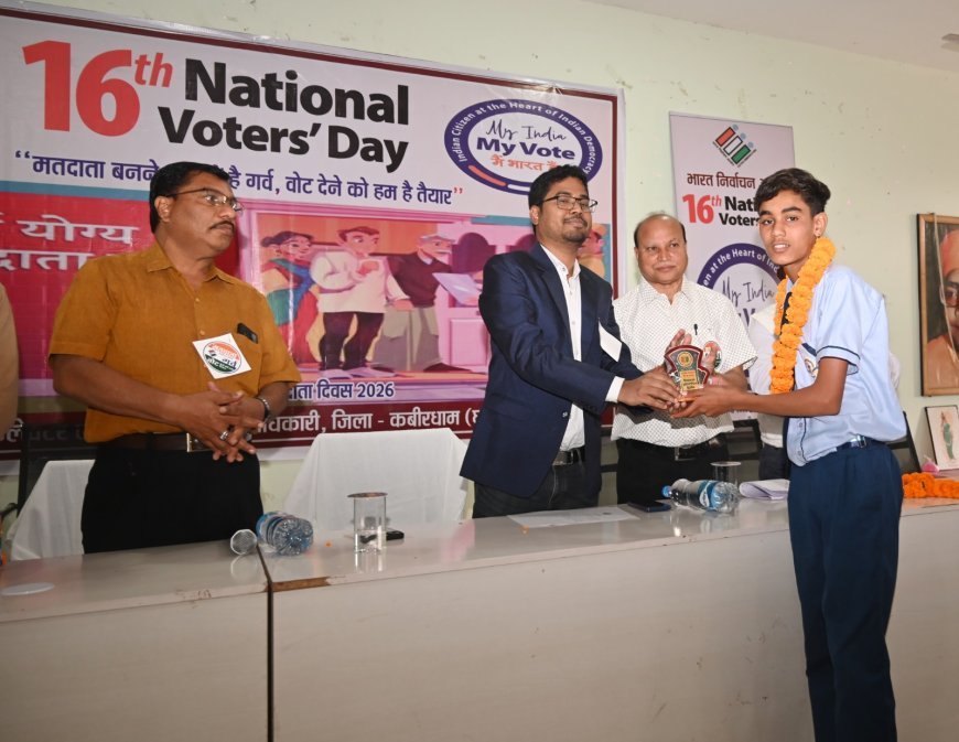 16वें राष्ट्रीय मतदाता दिवस के अवसर पर कबीरधाम जिले में जिला प्रशासन द्वारा जिला स्तरीय कार्यक्रम आयोजित किया गया। कार्यक्रम में नए मतदाताओं को बैच प्रदान किए गए तथा एसआईआर में उत्कृष्ट कार्य करने वाले बीएलओ को सम्मानित किया गया। साथ ही मतदाता जागरूकता को लेकर विभिन्न गतिविधियाँ संपन्न हुईं।