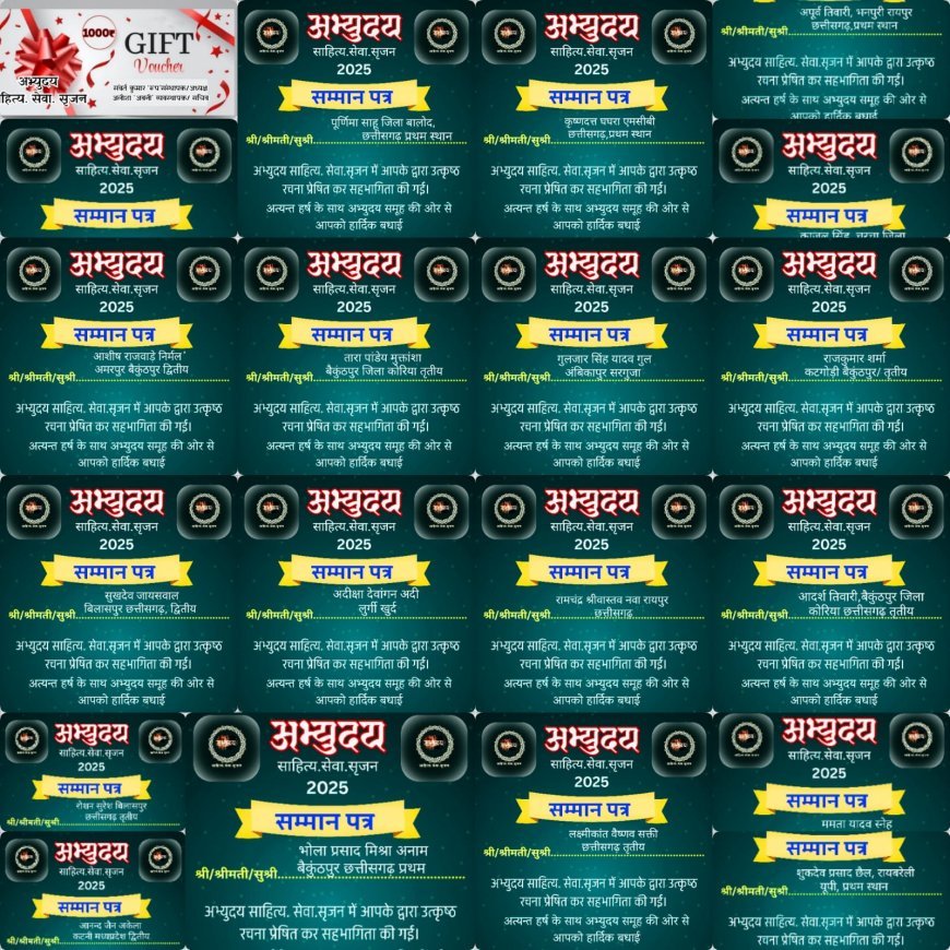 अभ्युदय साहित्य सेवा सृजन काव्य प्रतियोगिता में 100 से अधिक रचनाकारों ने हिस्सा लिया। बीपी मिश्रा ‘अनाम’ और पूर्णिमा साहू ने अपने वर्ग में पहला स्थान हासिल किया। 20 प्रतिभागियों को संयुक्त रूप से नगद पुरस्कार और सम्मान पत्र प्रदान किए गए।