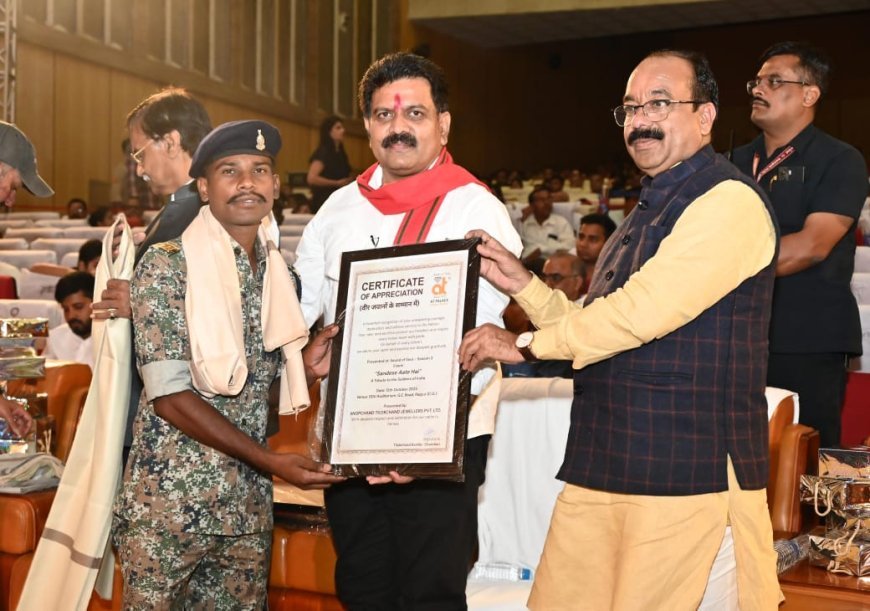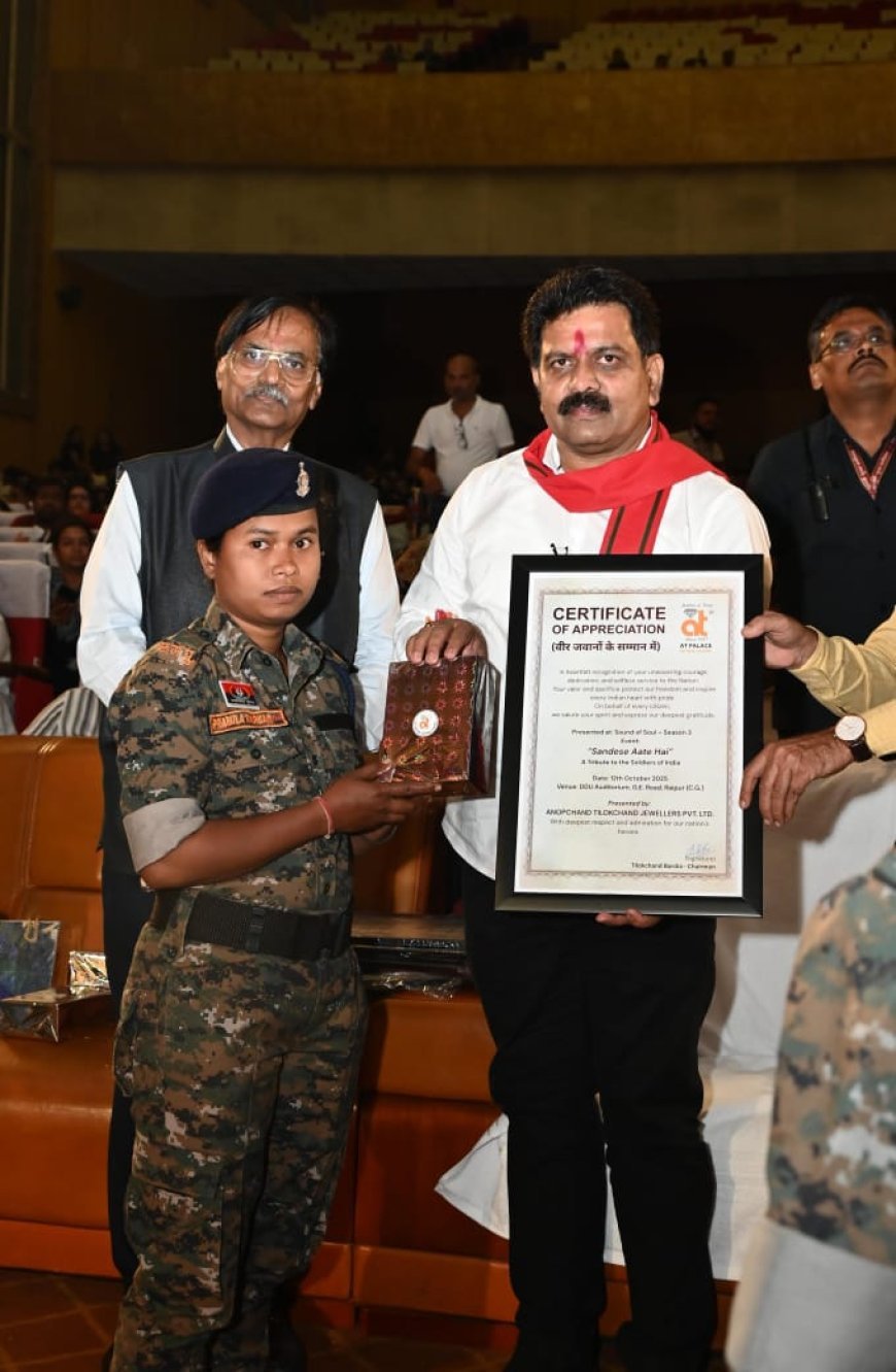 रायपुर में "साउंड ऑफ सोल 3.0" कार्यक्रम में उप मुख्यमंत्री विजय शर्मा और अरुण साव ने नक्सल विरोधी डीआरजी, बस्तर फाइटर और महिला जवानों का शाल एवं प्रशस्ति पत्र से सम्मान किया।