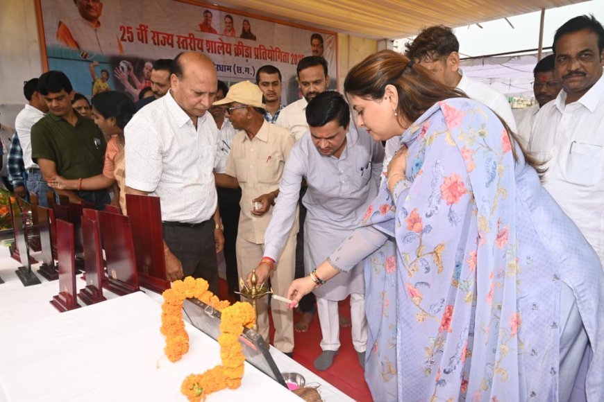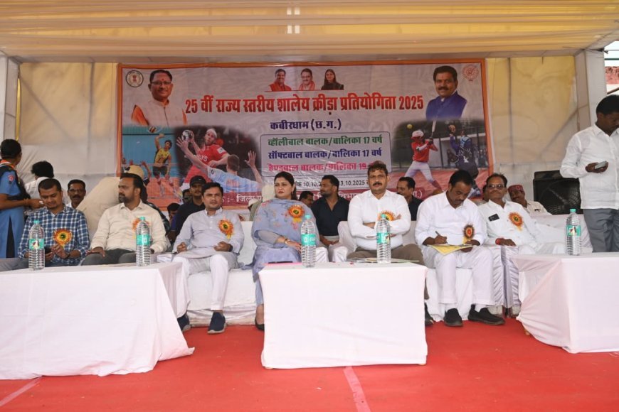 UNITED NEWS OF ASIA. कवर्धा । कबीरधाम जिले के स्वामी करपात्री स्टेडियम में आज 25वीं राज्य स्तरीय शालेय क्रीड़ा प्रतियोगिता 2025 का भव्य शुभारंभ हुआ। मुख्य अतिथि पंडरिया विधायक भावना बोहरा ने माँ सरस्वती के तैलचित्र पर दीप प्रज्ज्वलन कर प्रतियोगिता का शुभारंभ किया। इस अवसर पर जिला पंचायत अध्यक्ष श्री ईश्वरी साहू, पूर्व जिला पंचायत अध्यक्ष विदेशी राम धुर्वे, संतोष पटेल, कलेक्टर गोपाल वर्मा सहित जनप्रतिनिधि, अधिकारी और खेल प्रेमी बड़ी संख्या में उपस्थित रहे।