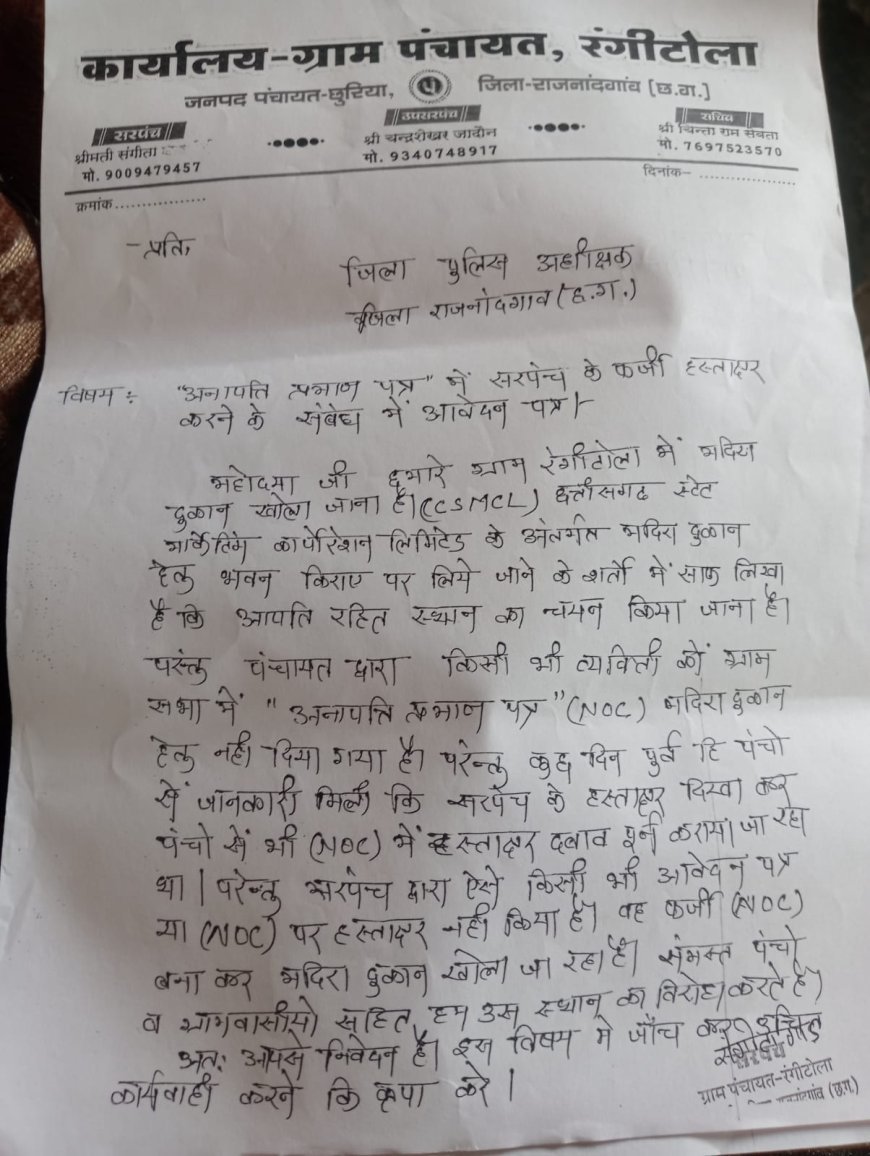UNITED NEWS OF ASIA. अभिषेक नामदेव, डोंगरगढ़ । रंगीटोला/चिचोला। ग्राम पंचायत रंगीटोला चिचोला में शराब दुकान (दारू भट्ठी) खोलने को लेकर बड़ा विवाद सामने आया है, जिससे पूरे गांव में हड़कंप मच गया है। इस मामले में सरपंच के फर्जी हस्ताक्षर किए जाने का गंभीर आरोप लगा है, वहीं ग्राम पंचायत के पंचों और ग्रामीणों ने भी इस प्रक्रिया पर सवाल खड़े किए हैं।