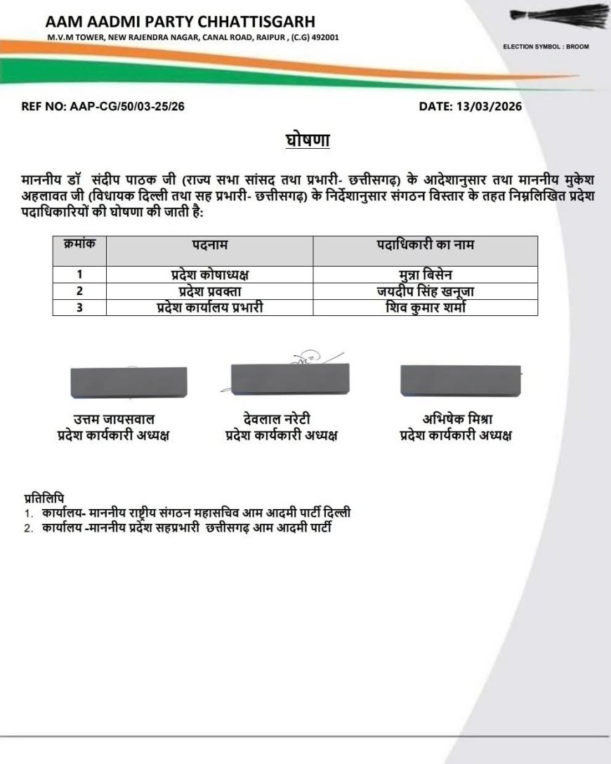 पार्टी नेतृत्व ने कहा कि छत्तीसगढ़ में आम आदमी पार्टी लगातार जनहित के मुद्दों को उठाती रही है और भविष्य में भी जनता से जुड़े मुद्दों पर सक्रियता के साथ काम करती रहेगी। संगठन को मजबूत करने के लिए लगातार नए कार्यकर्ताओं को जोड़ा जा रहा है और पार्टी का लक्ष्य प्रदेश में आम जनता की आवाज को प्रभावी तरीके से उठाना है।