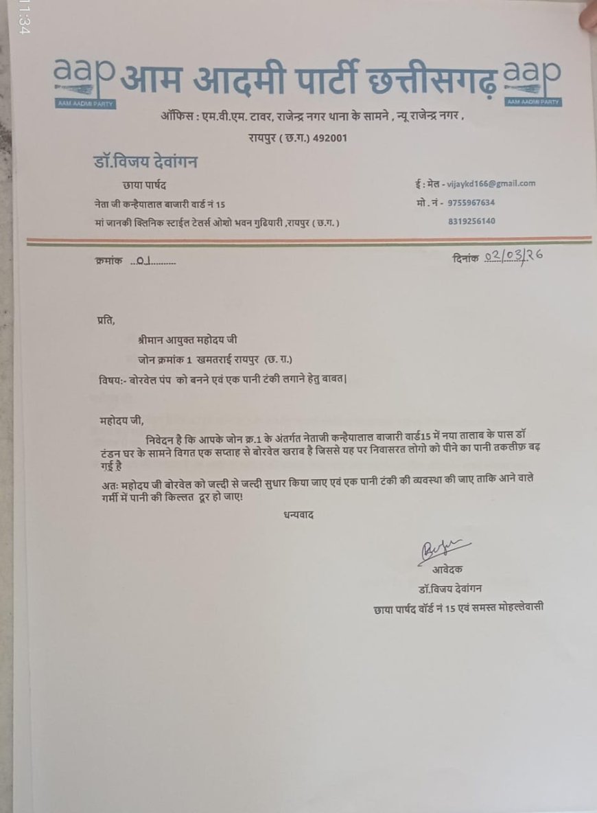 आम आदमी पार्टी रायपुर इकाई ने दोहराया कि वार्ड क्रमांक 15 में व्याप्त जल संकट का शीघ्र समाधान किया जाना अत्यंत आवश्यक है। पार्टी ने नगर निगम से मांग की है कि बोरवेल सुधार कार्य में देरी न करते हुए तुरंत वैकल्पिक जल आपूर्ति सुनिश्चित की जाए, ताकि क्षेत्र की जनता को बूंद-बूंद पानी के लिए संघर्ष न करना पड़े।