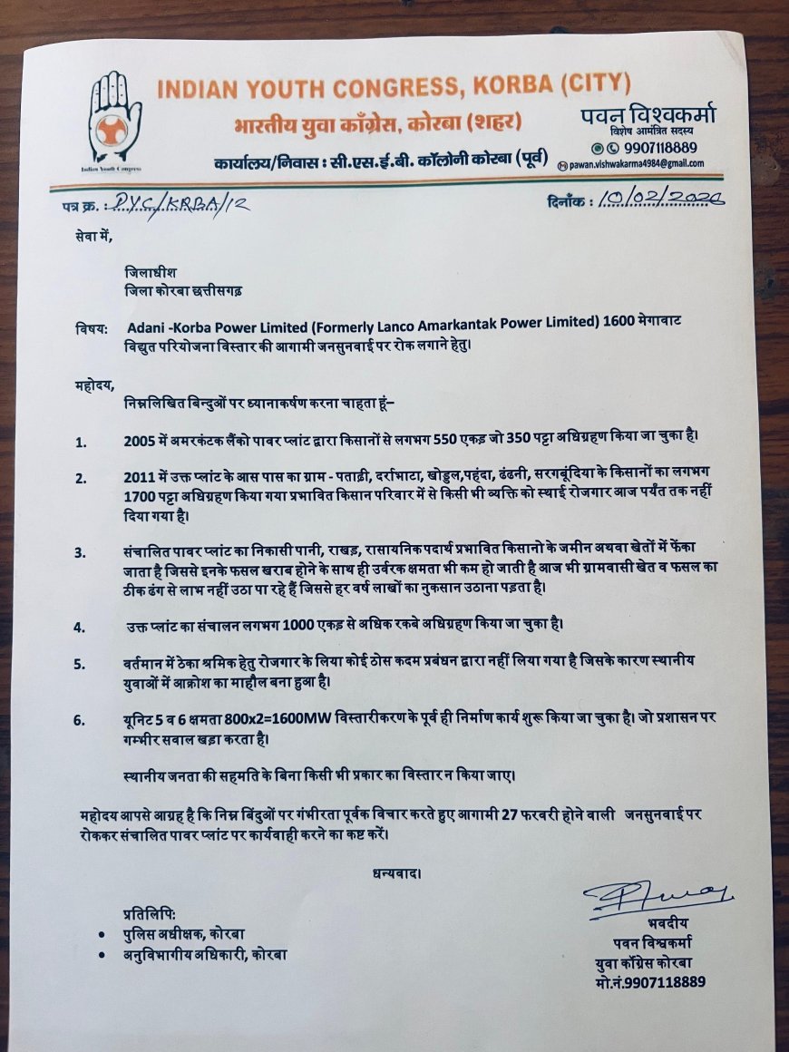 अडानी कोरबा पावर विस्तार परियोजना का विरोध, युवा कांग्रेस नेता पवन विश्वकर्मा ने जनसुनवाई रोकने की मांग उठाई