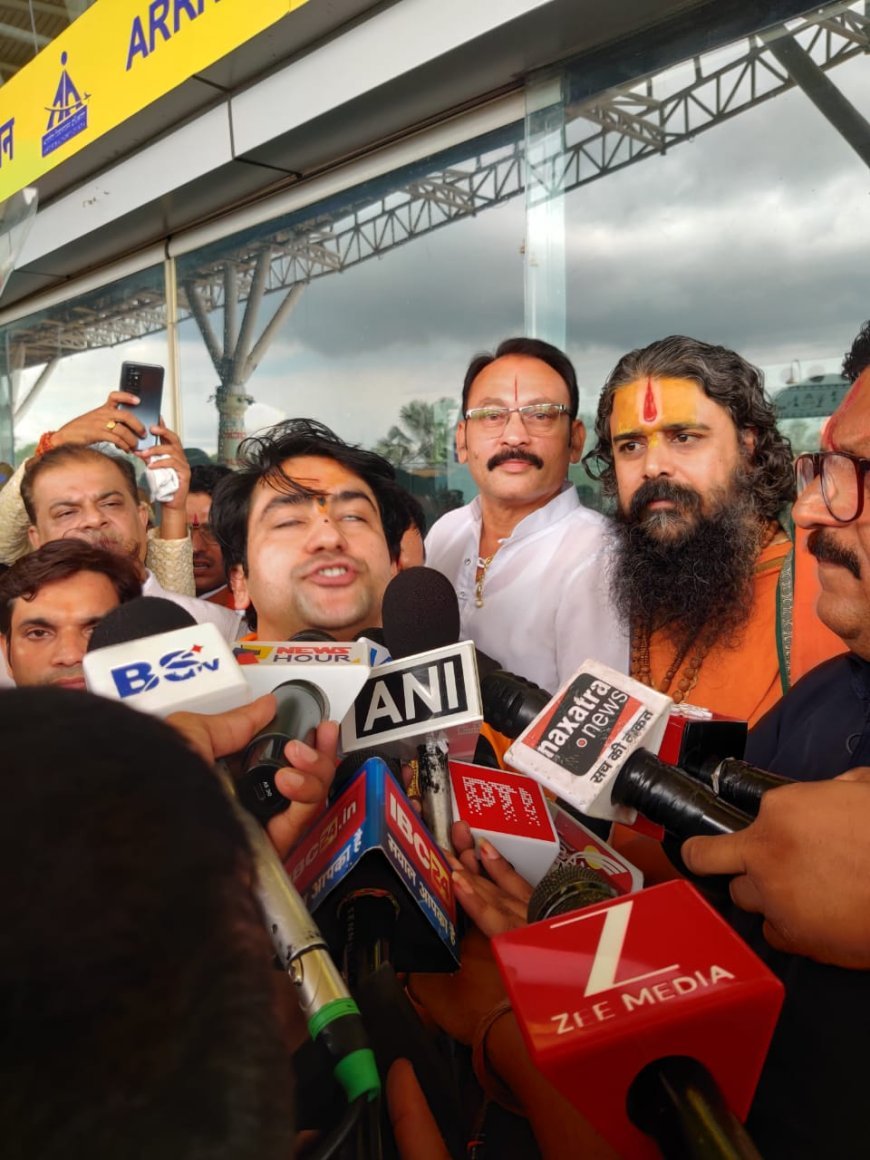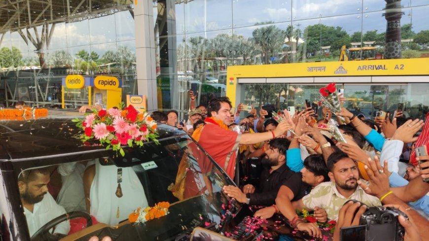 UNITED NEWS OF ASIA. अमृतेश्वर सिंह, रायपुर। बागेश्वर धाम पीठाधीश्वर पूज्य पं. धीरेंद्र कृष्ण शास्त्री का शनिवार को राजधानी रायपुर आगमन पर भक्तों ने ऐतिहासिक स्वागत किया। मध्यप्रदेश के मुरैना में कथा संपन्न करने के बाद वे नियमित विमान से विवेकानंद एयरपोर्ट पहुंचे, जहां युवा समाजसेवी बसंत अग्रवाल के नेतृत्व में सैकड़ों की संख्या में उपस्थित श्रद्धालुओं ने जयघोष और पुष्प वर्षा के साथ उनका स्वागत किया।