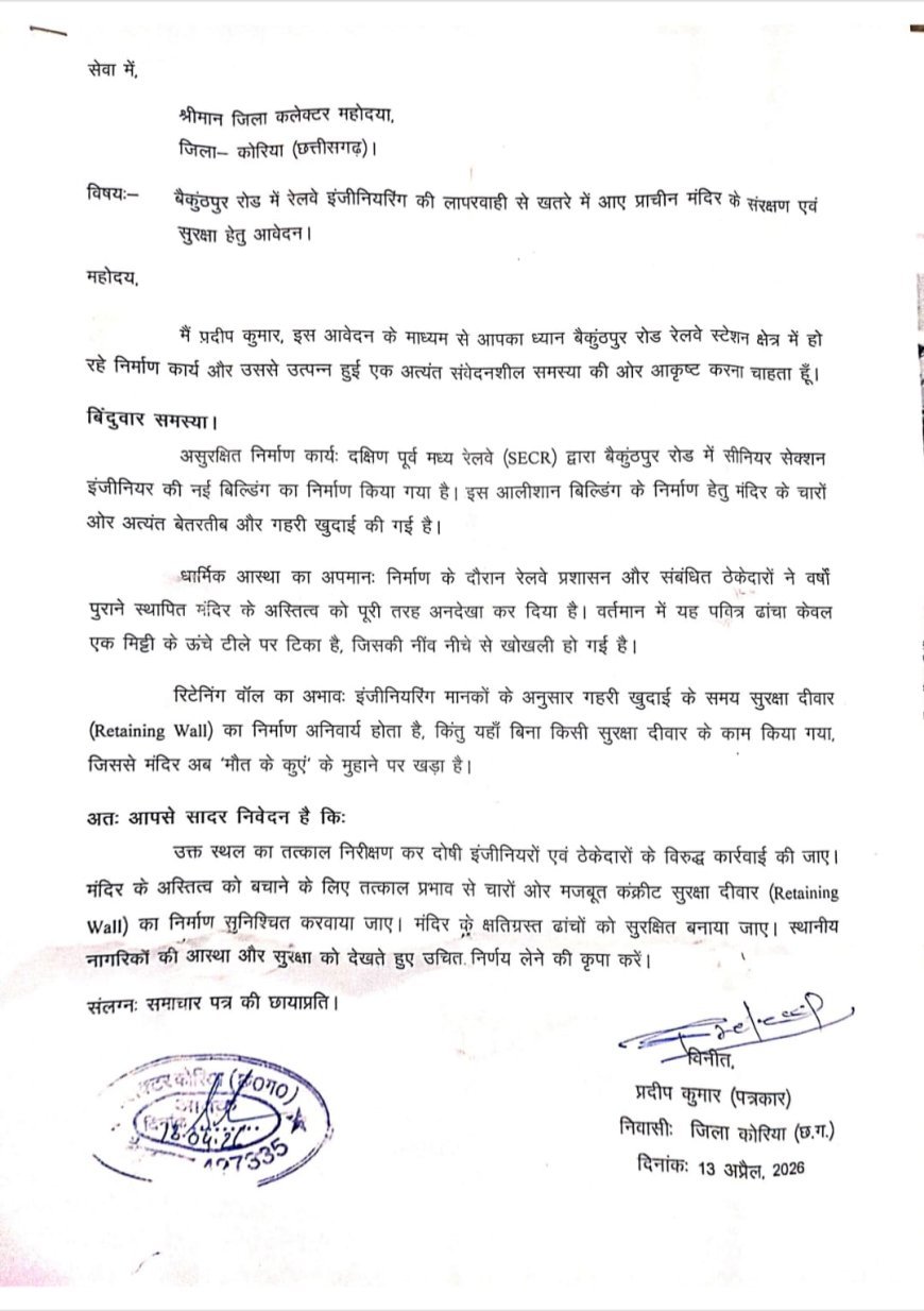 बैकुंठपुर में रेलवे निर्माण कार्य के दौरान लापरवाही के चलते एक प्राचीन मंदिर खतरे में आ गया है। युवा पत्रकार प्रदीप कुमार ने कलेक्टर से हस्तक्षेप और दोषियों पर कार्रवाई की मांग की है।