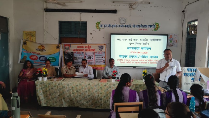 UNITED NEWS OF ASIA. परस साहू, बालोद । पुलिस अधीक्षक योगेश कुमार पटेल के निर्देशन में, अतिरिक्त पुलिस अधीक्षक मोनिका ठाकुर के मार्गदर्शन और डीएसपी माया शर्मा के पर्यवेक्षण में बालोद जिले में निरंतर जनजागरूकता अभियान चलाया जा रहा है। इसी क्रम में डीएसपी बोनिफेस एक्का के नेतृत्व में साइबर सेल और महिला सेल बालोद द्वारा डॉरन बाई तारम शासकीय महाविद्यालय गुरूर में एक विशेष जागरूकता कार्यक्रम आयोजित किया गया।