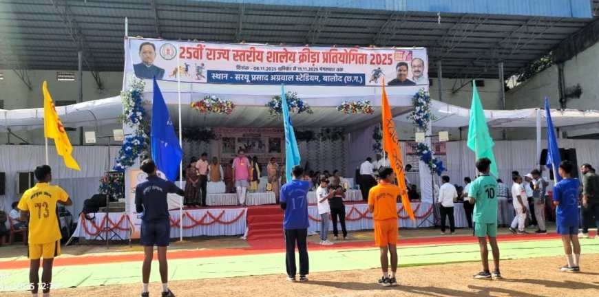 UNITED NEWS OF ASIA. परस साहू, बालोद। जिला मुख्यालय बालोद में चार दिवसीय 25वीं राज्य स्तरीय शालेय क्रीड़ा प्रतियोगिता का समापन स्वर्गीय सरयू प्रसाद अग्रवाल स्टेडियम में गरिमामय और रंगारंग समारोह के साथ हुआ। 8 से 11 नवंबर तक चली इस प्रतियोगिता में प्रदेश के सभी 5 जोनों से आए 420 छात्र-छात्राओं ने भाग लिया।