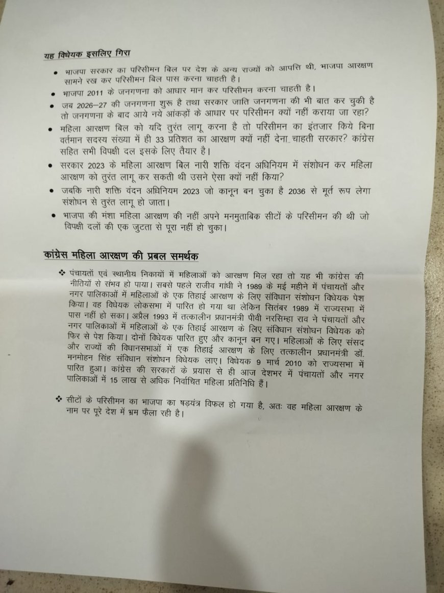 कांग्रेस का दावा है कि यदि भाजपा की मंशा साफ होती, तो मौजूदा लोकसभा और विधानसभा सीटों में ही 33 प्रतिशत महिला आरक्षण तुरंत लागू किया जा सकता था। लेकिन इसके बजाय सरकार इसे परिसीमन से जोड़कर देरी कर रही है।