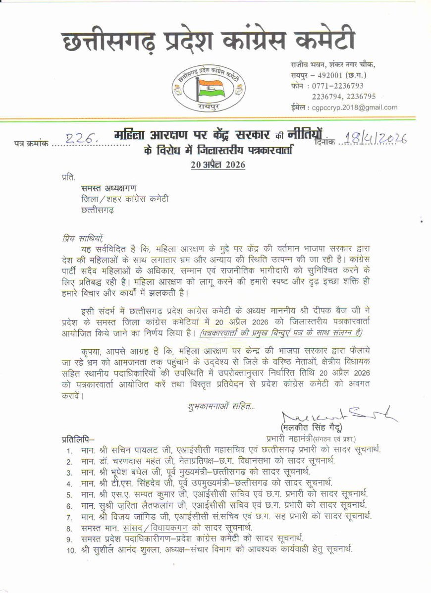 बलरामपुर में आज जिला कांग्रेस कमेटी द्वारा राजीव भवन में बैठक और प्रेस वार्ता आयोजित की जाएगी। महिला आरक्षण को लेकर केंद्र सरकार की नीतियों के विरोध में कांग्रेस अपनी रणनीति और विचार साझा करेगी।