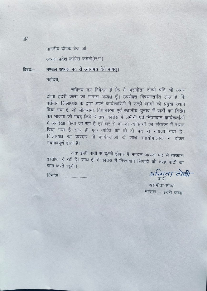 दोनों नेताओं ने अपना इस्तीफा छत्तीसगढ़ प्रदेश कांग्रेस अध्यक्ष दीपक बैज को भेजा है। इस्तीफे में उन्होंने संगठन की वर्तमान कार्यप्रणाली और जिला नेतृत्व की कार्यशैली पर गंभीर सवाल उठाए हैं।