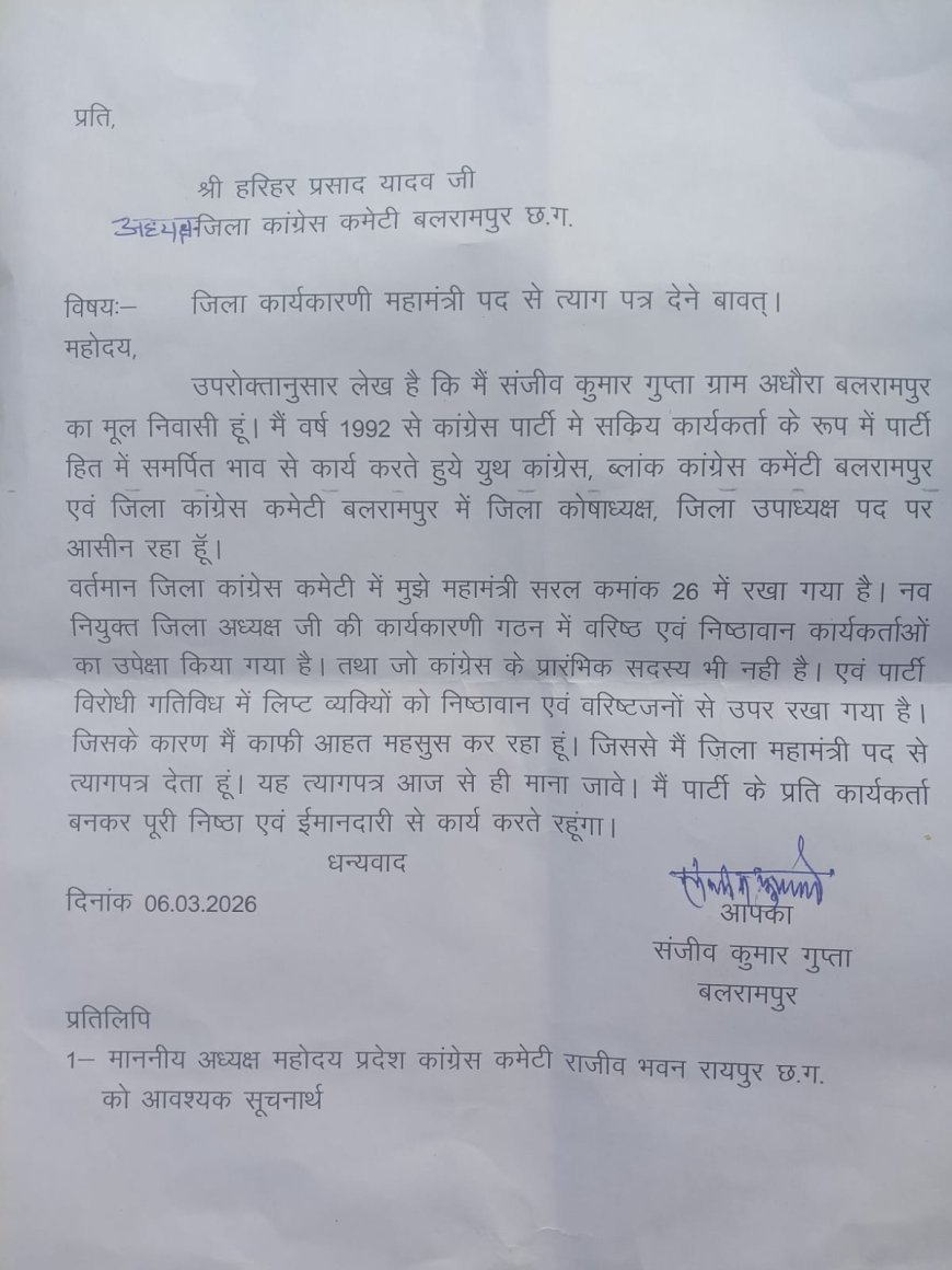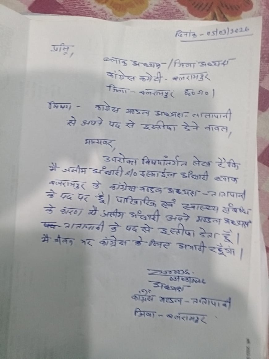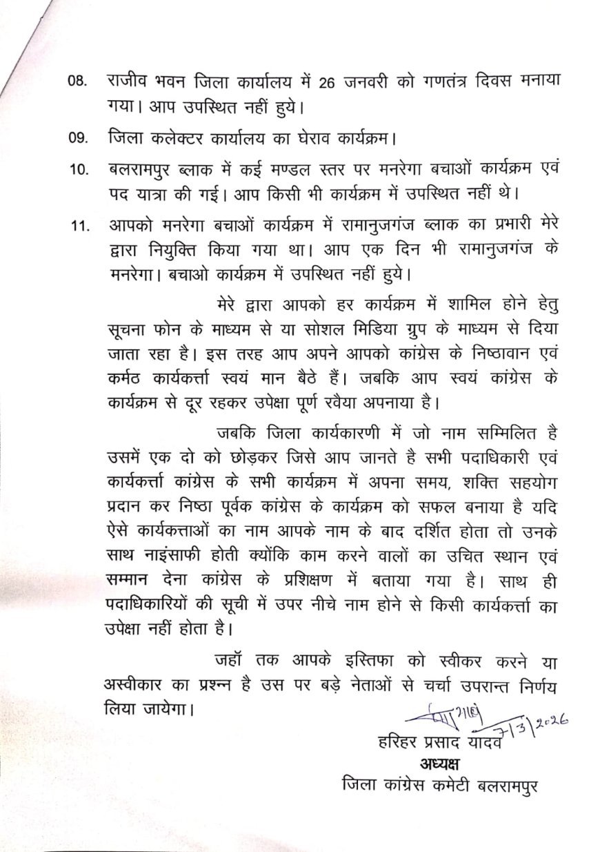 फिलहाल बलरामपुर कांग्रेस में जारी यह विवाद पार्टी के लिए चिंता का विषय बना हुआ है। आने वाले समय में यह देखना महत्वपूर्ण होगा कि पार्टी नेतृत्व इस आंतरिक असंतोष को किस तरह संभालता है और संगठन को एकजुट रखने के लिए क्या कदम उठाए जाते हैं।