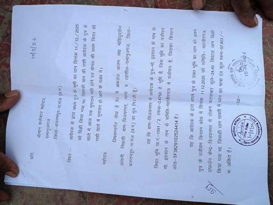 UNITED NEWS OF ASIA. अली खान, बलरामपुर। छत्तीसगढ़ के बलरामपुर जिले से एक ऐसी तस्वीर सामने आई है, जो सरकारी दावों और जमीनी हकीकत के बीच गहरी खाई को उजागर करती है। यहां विजयनगर का एक किसान अपनी ही मेहनत की फसल का भुगतान पाने के लिए महीनों से सरकारी दफ्तरों के चक्कर काटने को मजबूर है।