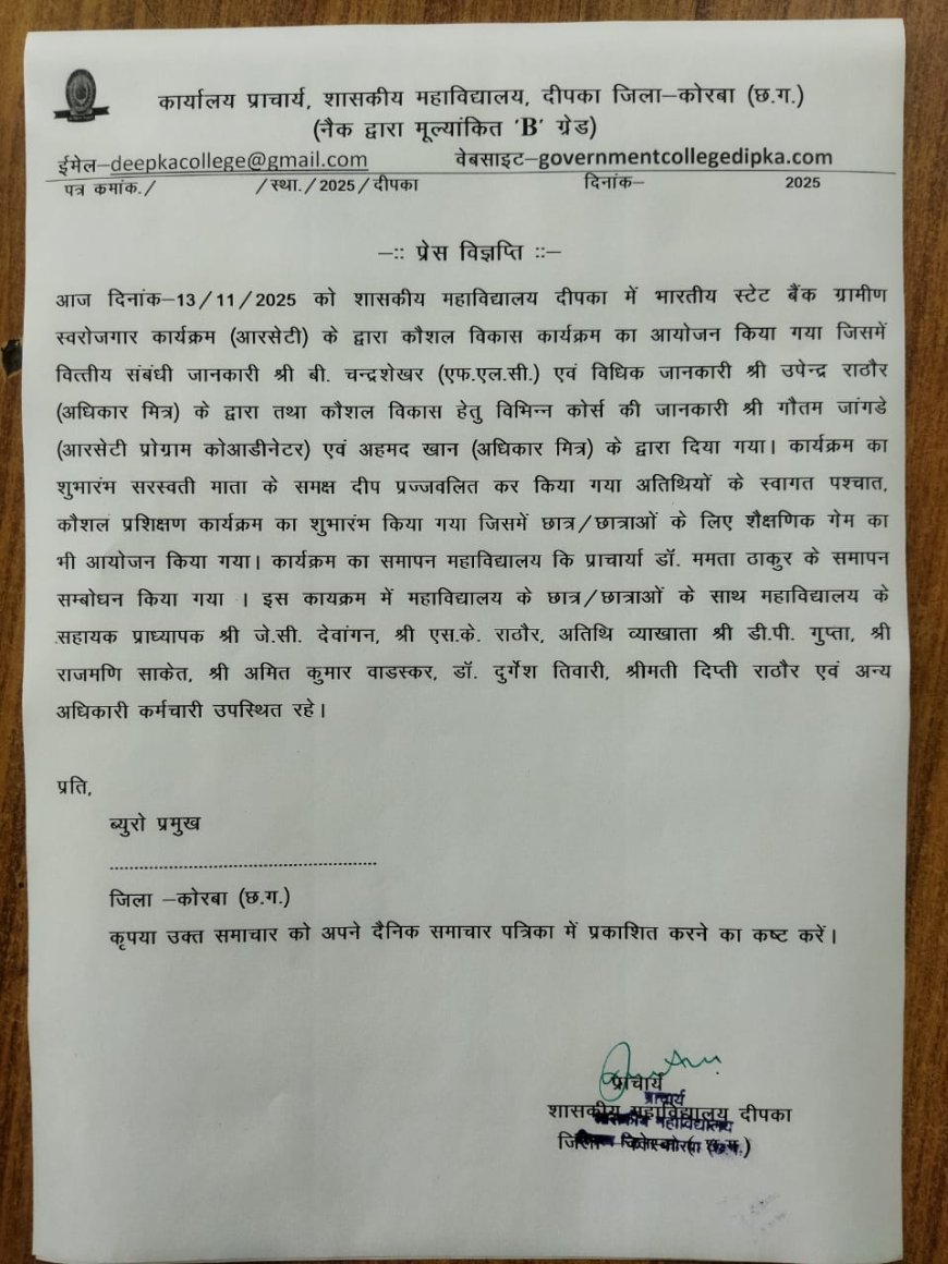 दीपका स्थित शासकीय महाविद्यालय में एसबीआई ग्रामीण स्वरोजगार प्रशिक्षण संस्थान द्वारा कौशल विकास कार्यक्रम आयोजित किया गया। इसमें छात्रों को वित्तीय साक्षरता, विधिक अधिकार व विभिन्न कौशल कोर्सों की जानकारी दी गई। कार्यक्रम का समापन प्राचार्य ममता ठाकुर के संबोधन से हुआ।