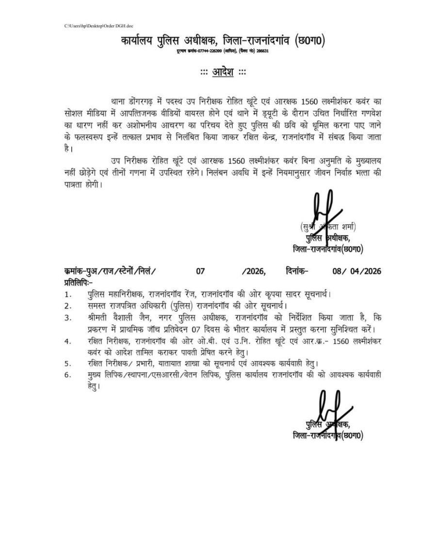 मामला सामने आते ही जिला पुलिस प्रशासन ने त्वरित कार्रवाई की। पुलिस अधीक्षक अंकिता शर्मा ने इस प्रकरण को गंभीरता से लेते हुए दोनों पुलिसकर्मियों के खिलाफ सख्त कदम उठाए। एएसआई रोहित खूंटे और आरक्षक लक्ष्मीशंकर कंवर को तत्काल प्रभाव से निलंबित कर दिया गया है।