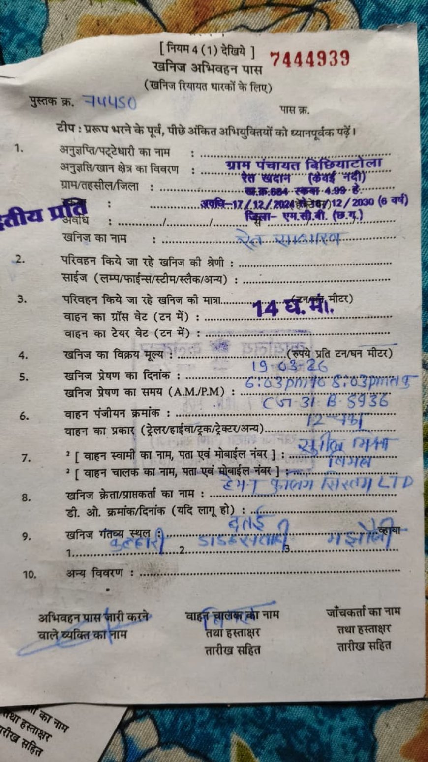 आरोप है कि बिछिया टोला खदान की रॉयल्टी पर्चियों का उपयोग भंडारण से काटकर मध्यप्रदेश तक रेत परिवहन में किया जा रहा है।