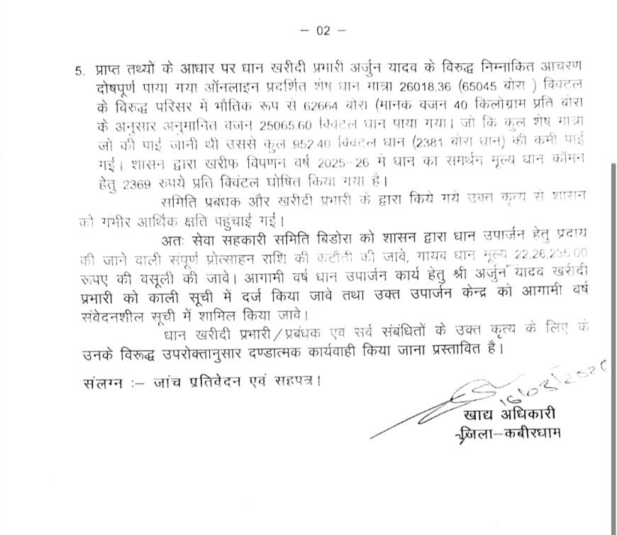 UNITED NEWS OF ASIA. सौरभ नामदेव कवर्धा l छत्तीसगढ़ के कबीरधाम जिले में धान खरीदी व्यवस्था एक बार फिर विवादों में घिर गई है। जिले के विभिन्न उपार्जन केंद्रों में लगातार सामने आ रही अनियमितताओं ने पूरे सिस्टम की पारदर्शिता पर गंभीर सवाल खड़े कर दिए हैं। ताजा मामला सेवा सहकारी समिति बिडोरा के अंतर्गत संचालित धान उपार्जन केंद्र का है, जहां जांच के दौरान लाखों रुपये मूल्य के धान की कमी पाई गई है।