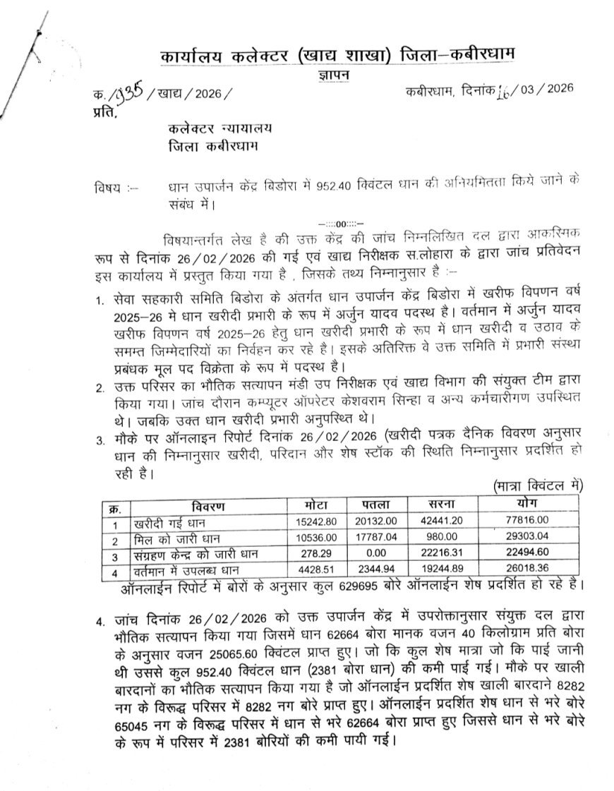 कबीरधाम में धान खरीदी घोटाले का खुलासा, बिडोरा केंद्र में लाखों की कमी उजागर