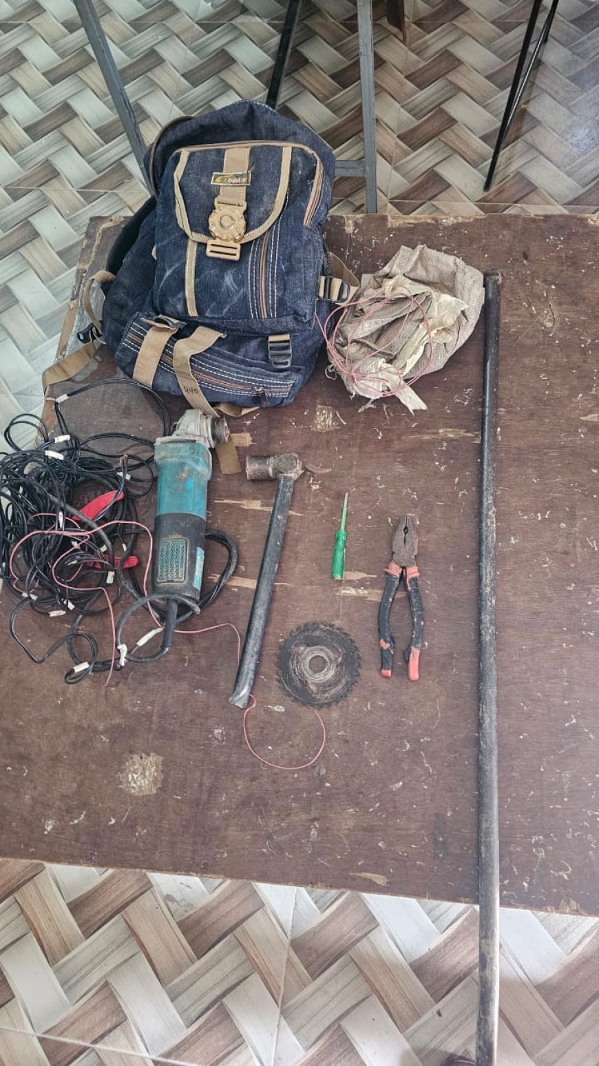 मौके से ग्राइंडर मशीन का टूटा पत्ती का टुकड़ा और औजारों से भरा बैग बरामद किया गया।