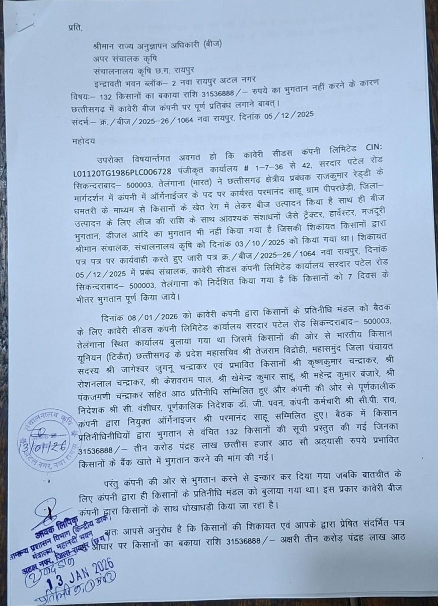 कावेरी सीड्स कंपनी पर 132 किसानों से 3.15 करोड़ रुपये हड़पने का गंभीर आरोप, किसानों में आक्रोश