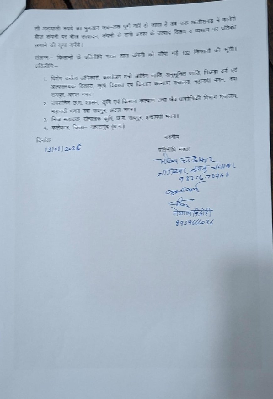 महासमुंद, रायपुर और बलौदाबाजार जिले के 132 किसानों ने कावेरी सीड्स कंपनी पर 3 करोड़ 15 लाख रुपये की धोखाधड़ी का आरोप लगाया है। किसानों ने राज्यपाल, मुख्यमंत्री और बीज अनुज्ञापन अधिकारी से कंपनी के सभी उत्पादों और व्यापार पर तत्काल प्रतिबंध लगाने की मांग की है।