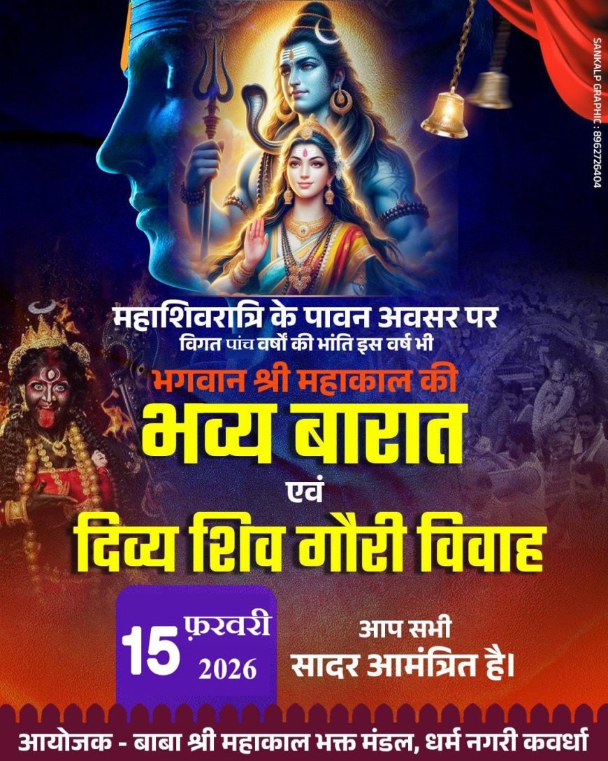 महाशिवरात्रि के अवसर पर 15 फरवरी को धर्मनगरी कवर्धा में भगवान श्री महाकाल की भव्य बारात और शिव–गौरी का दिव्य विवाह आयोजित होगा। काल भैरव की पहली अलौकिक झांकी, पर्यावरण संरक्षण का संदेश और विशाल भक्ति आयोजन इस वर्ष की विशेष पहचान होगी।