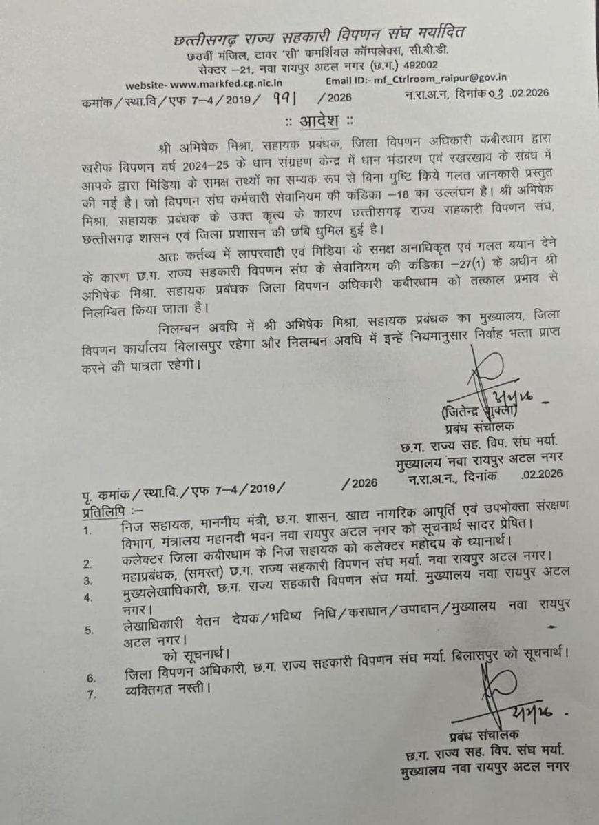 UNITED NEWS OF ASIA. कवर्धा | छत्तीसगढ़ के कवर्धा जिले में धान शॉर्टेज से जुड़े बड़े मामले में प्रशासन ने सख्त कार्रवाई करते हुए जिला विपणन अधिकारी (डीएमओ) अभिषेक मिश्रा को निलंबित कर दिया है। यह कार्रवाई राज्य स्तर पर रायपुर स्थित प्रबंध संचालक द्वारा 3 फरवरी 2026 को की गई। बताया जा रहा है कि मीडिया में दिए गए उनके विवादित और भ्रामक बयान को कार्रवाई का मुख्य कारण माना गया है। आदेश जारी होने के बाद जिला प्रशासन में हलचल तेज हो गई है।