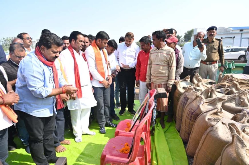 UNITED NEWS OF ASIA. कवर्धा। उपमुख्यमंत्री विजय शर्मा ने आज कबीरधाम जिले के बोड़ला विकासखंड स्थित धान उपार्जन केंद्र महाराजपुर से समर्थन मूल्य पर धान खरीदी महापर्व का विधिवत शुभारंभ किया। उन्होंने पूजा-अर्चना कर, किसानों को तिलक लगाकर, श्रीफल भेंट कर एवं माल्यार्पण कर खरीदी प्रक्रिया की शुरुआत की।