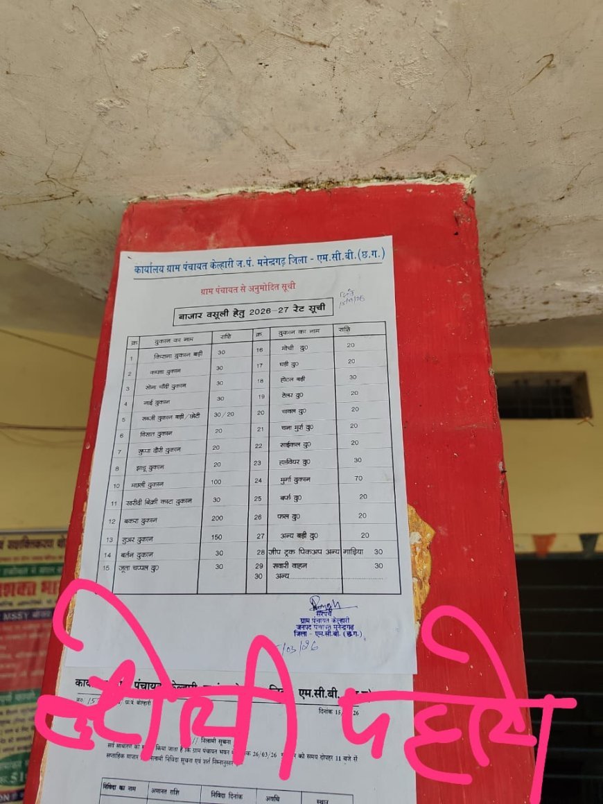 UNITED NEWS OF ASIA. महेंद्र सुकला। केल्हारी ग्राम पंचायत में साप्ताहिक बाजार वसूली को लेकर एक विवाद सामने आया है, जिसने पंचायत प्रशासन की कार्यप्रणाली पर गंभीर सवाल खड़े कर दिए हैं। मामला मनेन्द्रगढ़-चिरमिरी-भरतपुर जिला से जुड़ा है, जहां वर्ष 2026-27 के लिए बाजार वसूली की नीलामी प्रक्रिया के बाद अचानक रेट लिस्ट में बदलाव किए जाने के आरोप लगे हैं।