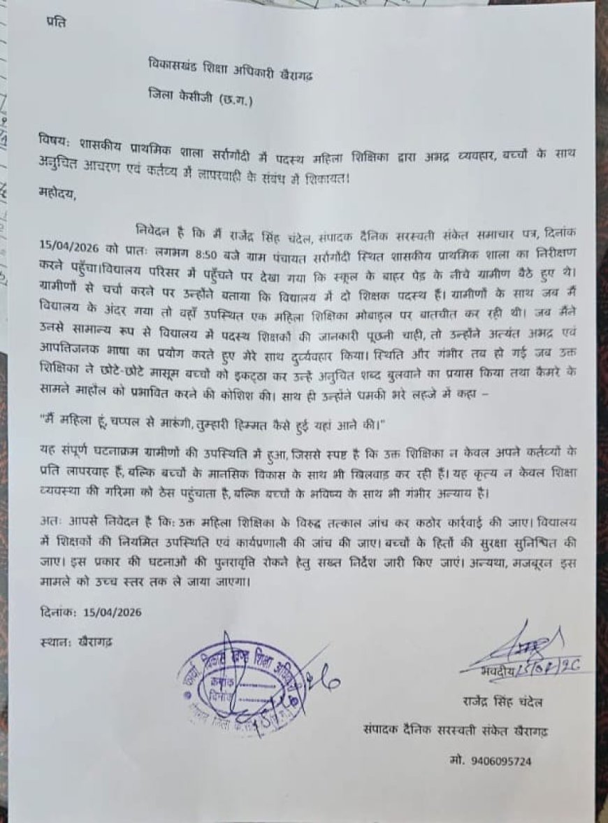 UNITED NEWS OF ASIA. मनोहर सेन, खैरागढ़। छत्तीसगढ़ के खैरागढ़-छुईखदान-गंडई (KCG) जिले के ग्राम सर्रागोंदी स्थित शासकीय प्राथमिक शाला से शिक्षा व्यवस्था को शर्मसार करने वाला मामला सामने आया है। यहां पदस्थ एक महिला शिक्षिका पर पत्रकार के साथ दुर्व्यवहार करने और बच्चों को विवाद में शामिल करने जैसे गंभीर आरोप लगाए गए हैं।