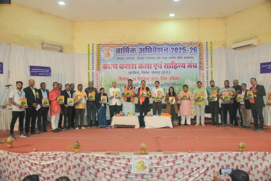 UNITED NEWS OF ASIA. अमृतेश्वर सिंह, रायपुर | काव्य कलश कला एवं साहित्य मंच, खरसिया (जिला रायगढ़) द्वारा आयोजित पंचम वार्षिक अधिवेशन, सम्मान समारोह एवं अखिल भारतीय कवि सम्मेलन का भव्य आयोजन 14 दिसंबर 2025, रविवार को लखीराम अग्रवाल ऑडिटोरियम, ठाकुरदिया खरसिया में हर्षोल्लास के साथ सम्पन्न हुआ। प्रातः 10 बजे से शाम 6 बजे तक चले इस साहित्यिक महोत्सव में प्रदेशभर के साथ-साथ उत्तरप्रदेश से आए कवियों, साहित्यकारों एवं साहित्यप्रेमियों ने उत्साहपूर्वक सहभागिता की।