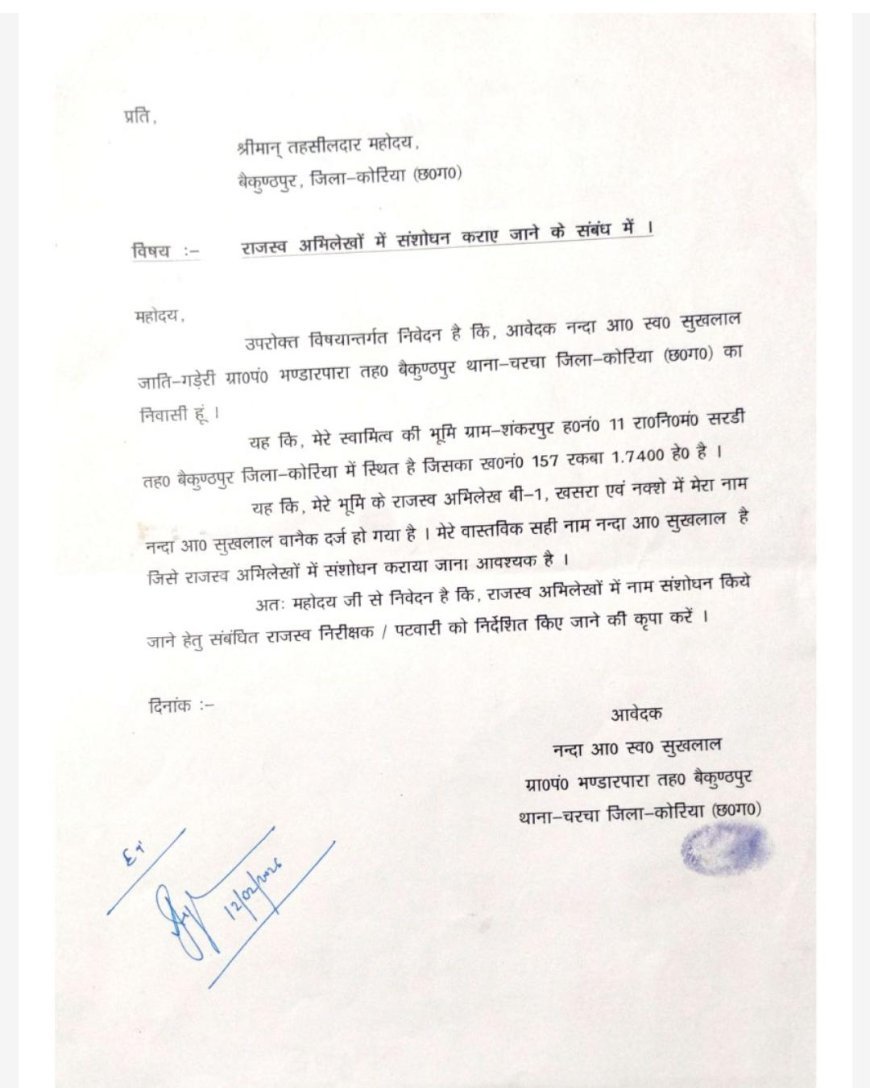 UNITED NEWS OF ASIA. महेंद्र शुक्ला, कोरिया। जिले के बैकुंठपुर तहसील अंतर्गत ग्राम शंकरपुर से एक भूमि विवाद का मामला सामने आया है, जिसने राजस्व रिकॉर्ड की पारदर्शिता और प्रशासनिक प्रक्रियाओं पर सवाल खड़े कर दिए हैं।