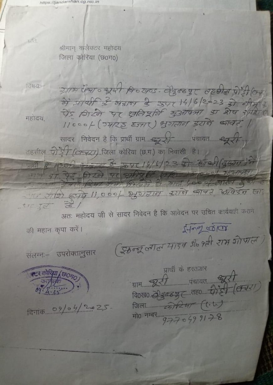 UNITED NEWS OF ASIA. प्रदीप पाटकर, कोरिया। बैकुंठपुर (कोरिया) जिले से एक ऐसा मामला सामने आया है, जो प्रशासनिक व्यवस्था और मुआवजा प्रणाली पर सवाल खड़े करता है। ग्राम छुरी के किसान झन्नू लाल यादव पिछले तीन वर्षों से अपने नुकसान की पूरी भरपाई के लिए सरकारी दफ्तरों के चक्कर काट रहे हैं, लेकिन अब तक उन्हें न्याय नहीं मिल पाया है।
