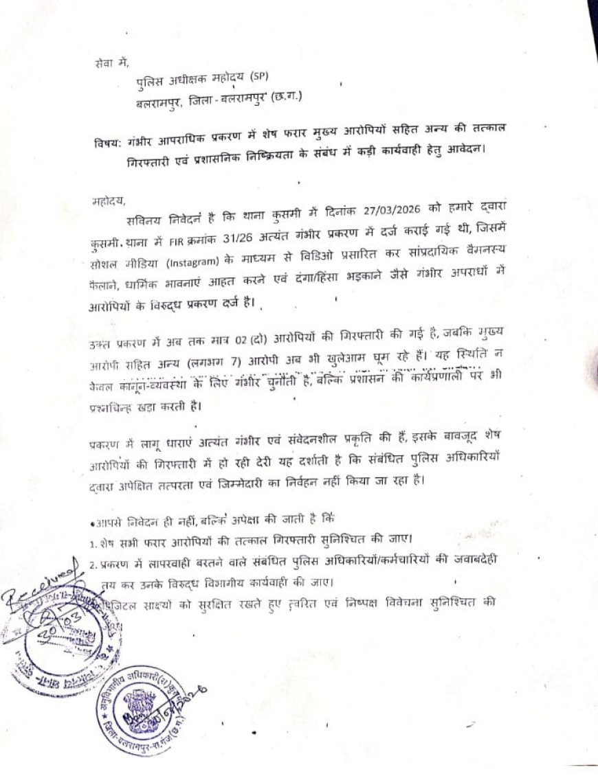 बलरामपुर जिले के कुसमी क्षेत्र में विवादित मामले को लेकर मुस्लिम समुदाय में आक्रोश बढ़ गया है। आरोपी की गिरफ्तारी न होने पर समुदाय ने चक्का जाम और उग्र आंदोलन की चेतावनी दी है।