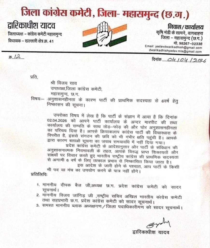 महासमुंद में कांग्रेस का बड़ा एक्शन: विजय साव 6 साल के लिए निष्कासित, अनुशासनहीनता पर सख्ती