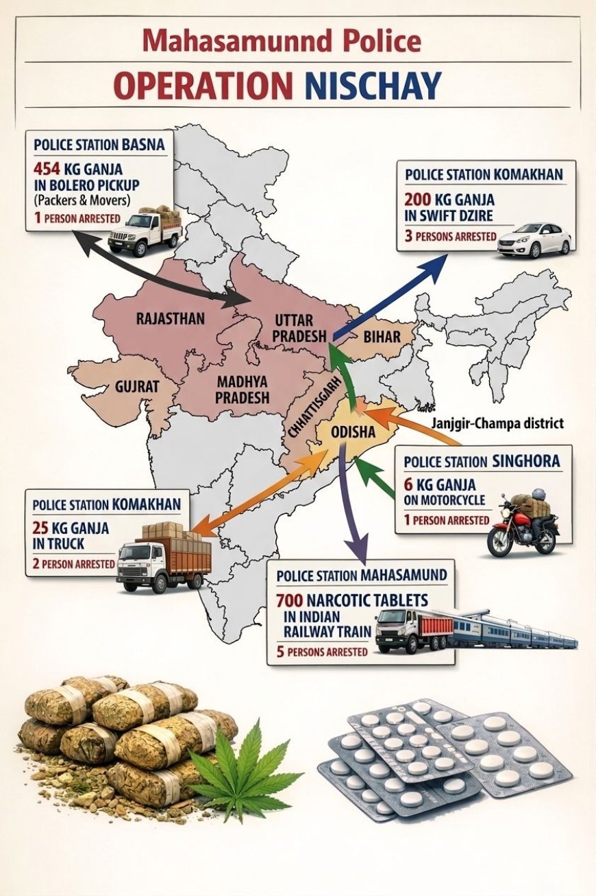 छत्तीसगढ़ के महासमुंद जिले में “ऑपरेशन निश्चय” के तहत पुलिस ने 10 घंटे के भीतर 685 किलो से अधिक गांजा और 700 नशीली टैबलेट जब्त कर 13 तस्करों को गिरफ्तार किया। जब्त सामग्री की कुल कीमत 4.61 करोड़ रुपये से अधिक बताई गई है।