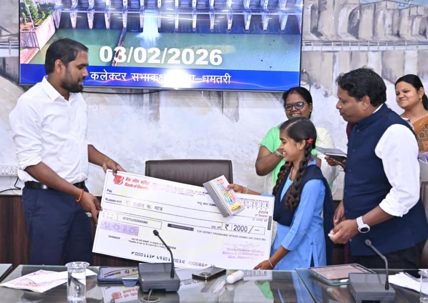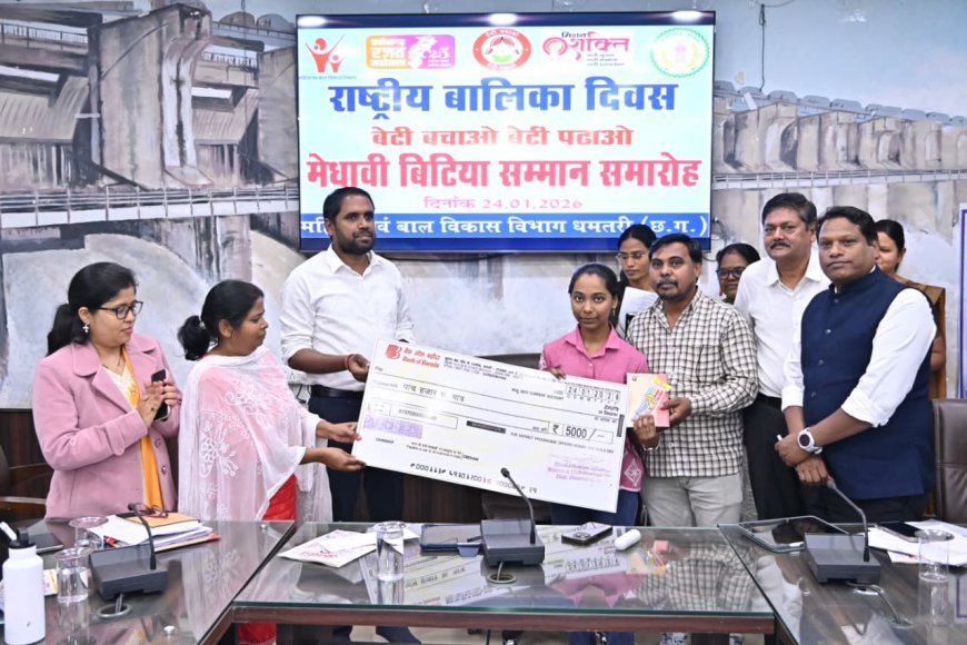 UNITED NEWS OF ASIA. रिजवान मेमन, धमतरी | धमतरी जिले में रजत जयंती वर्ष 2025 के उपलक्ष्य में महिला एवं बाल विकास विभाग द्वारा आयोजित राज्य स्तरीय “मेधावी बेटियां सम्मान कार्यक्रम” के अंतर्गत कलेक्ट्रेट सभाकक्ष में शासकीय विद्यालयों की मेधावी छात्राओं को सम्मानित किया गया। कार्यक्रम में कलेक्टर अबिनाश मिश्रा ने शैक्षणिक सत्र 2025-26 की कक्षा 10वीं एवं 12वीं की परीक्षाओं में सर्वाधिक अंक प्राप्त करने वाली प्रथम तीन-तीन छात्राओं को प्रशस्ति-पत्र एवं प्रोत्साहन राशि प्रदान कर सम्मानित किया।