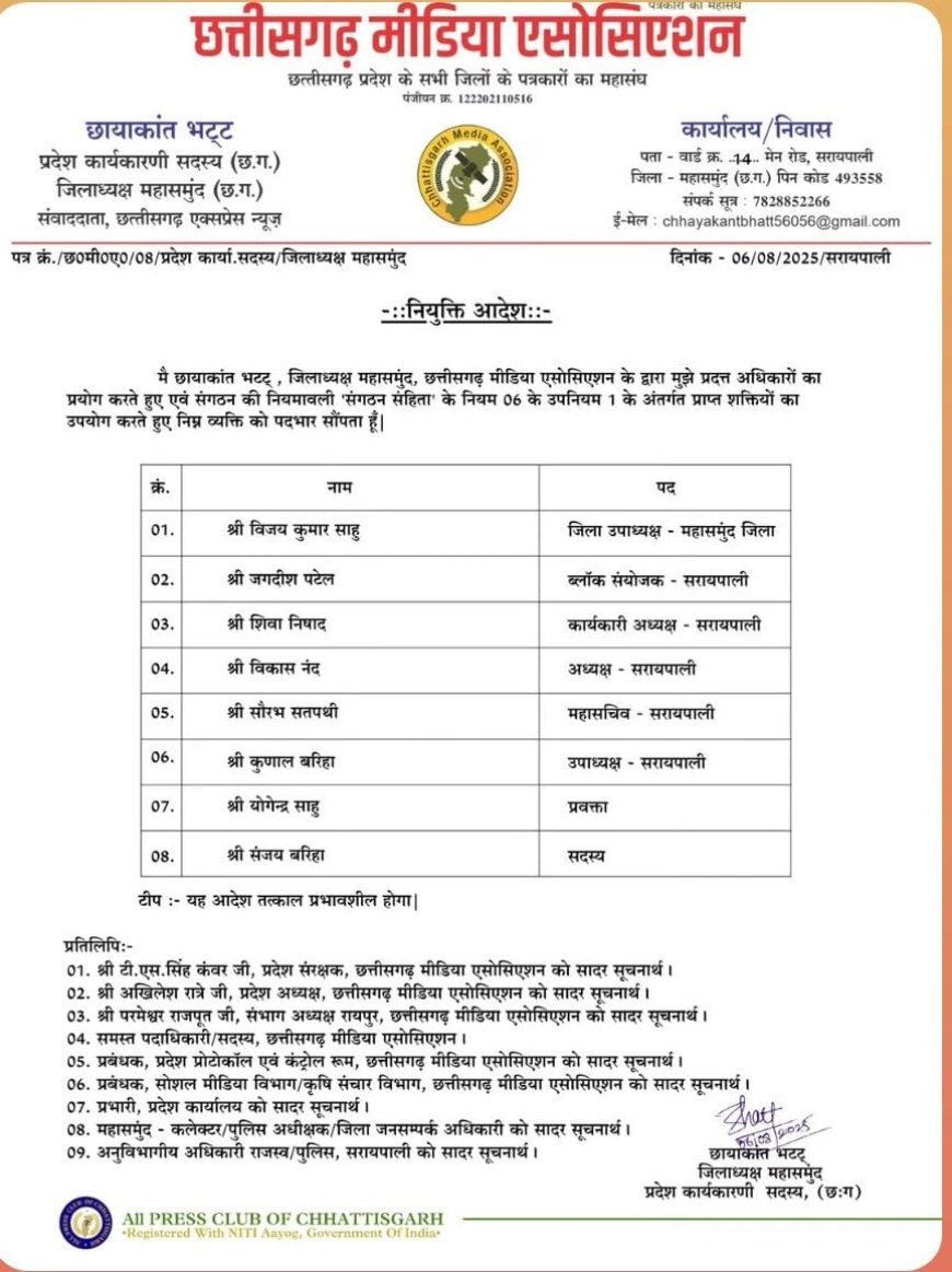 UNITED NEWS OF ASIA. जगदीश पटेल, सरायपाली/महासमुंद। छत्तीसगढ़ मीडिया एसोसिएशन के महासमुंद जिलाध्यक्ष और जिले के सबसे युवा पत्रकार छायाकांत भट्ट ने आज सुबह प्रदेश के मुख्यमंत्री विष्णुदेव साय को फोन कर वरिष्ठ मीडिया कर्मियों के सम्मान राशि में वृद्धि के लिए आभार व्यक्त किया।