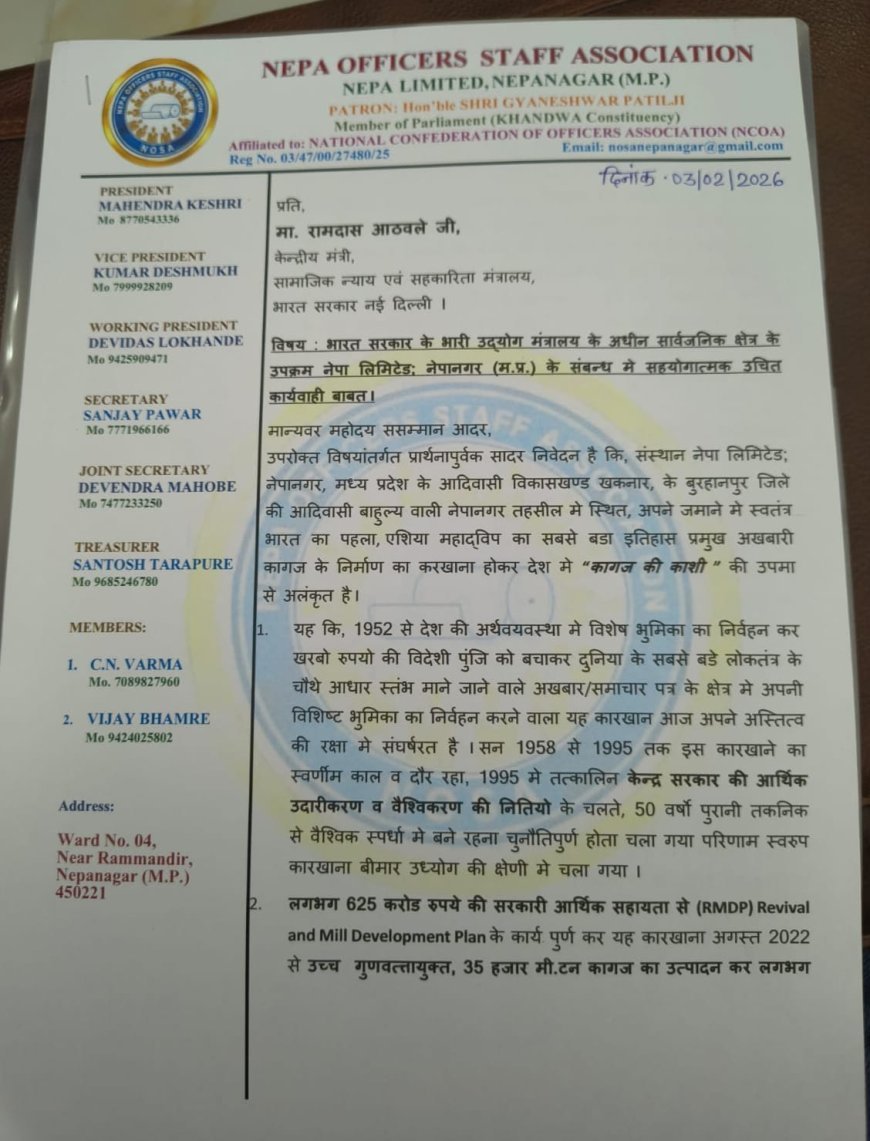प्रतिनिधिमंडल ने केंद्रीय मंत्री रामदास आठवले को नेपा मिल को सतत रूप से चालू रखने, स्थानीय स्तर पर रोजगार बनाए रखने और अधिकारियों एवं कर्मचारियों की लंबित मांगों के शीघ्र निराकरण की आवश्यकता से अवगत कराया। चर्चा के दौरान बताया गया कि नेपा मिल के अधिकारी और कर्मचारी पिछले 14 माह से वेतन भुगतान से वंचित हैं, जिससे कर्मचारियों और उनके परिवारों को गंभीर आर्थिक समस्याओं का सामना करना पड़ रहा है। इसके अलावा वर्ष 2007 और 2017 से लंबित वेतनमान लागू करने की मांग भी रखी गई।