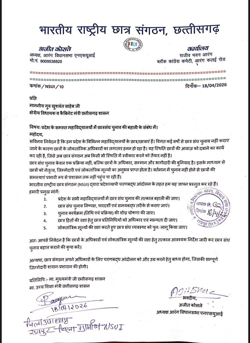 UNITED NEWS OF ASIA. अमृतेश्वर सिंह, रायपुर l छत्तीसगढ़ में छात्रसंघ चुनाव बहाली की मांग एक बार फिर तेज हो गई है। इसी कड़ी में रायपुर ग्रामीण एनएसयूआई ने धरसीवा, आरंग और अभनपुर क्षेत्रों में जनप्रतिनिधियों को ज्ञापन सौंपकर सरकार से तत्काल छात्रसंघ चुनाव कराने की मांग की है। संगठन के इस कदम को छात्रों के लोकतांत्रिक अधिकारों की बहाली के प्रयास के रूप में देखा जा रहा है।