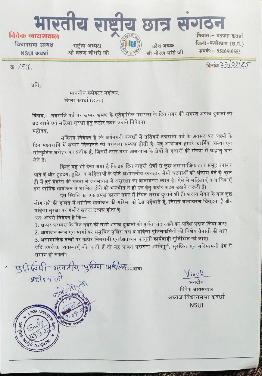 UNITED NEWS OF ASIA. कवर्धा। नवरात्रि पर्व के दौरान आयोजित होने वाली ऐतिहासिक खप्पर भ्रमण परंपरा को शांति और सुरक्षा के साथ सम्पन्न कराने की मांग को लेकर भारतीय राष्ट्रीय छात्र संगठन (NSUI) ने जिला प्रशासन से हस्तक्षेप की मांग की है। विधानसभा कवर्धा NSUI अध्यक्ष विवेक जायसवाल के नेतृत्व में संगठन के प्रतिनिधिमंडल ने कलेक्टर को ज्ञापन सौंपते हुए नगर की सभी शराब दुकानों को बंद करने और महिला सुरक्षा के लिए ठोस कदम उठाने की मांग की।