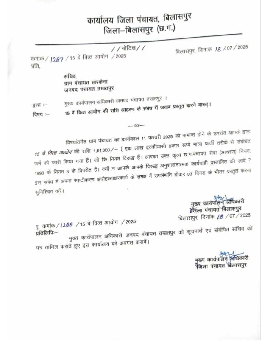 तखतपुर जनपद क्षेत्र में आचार संहिता के दौरान 15वें वित्त आयोग की राशि का अवैध आहरण कर 21 सचिवों ने गंभीर नियम उल्लंघन किया। जिला पंचायत CEO ने जुलाई में नोटिस जारी किया, लेकिन चार महीने बाद भी कोई कार्रवाई नहीं हुई। सचिवों का दावा—आदेश नहीं मिला। प्रशासन का जवाब—तकनीकी मामला, रायपुर से मार्गदर्शन मांगा गया है। कुल आहरित राशि 41 लाख से अधिक।