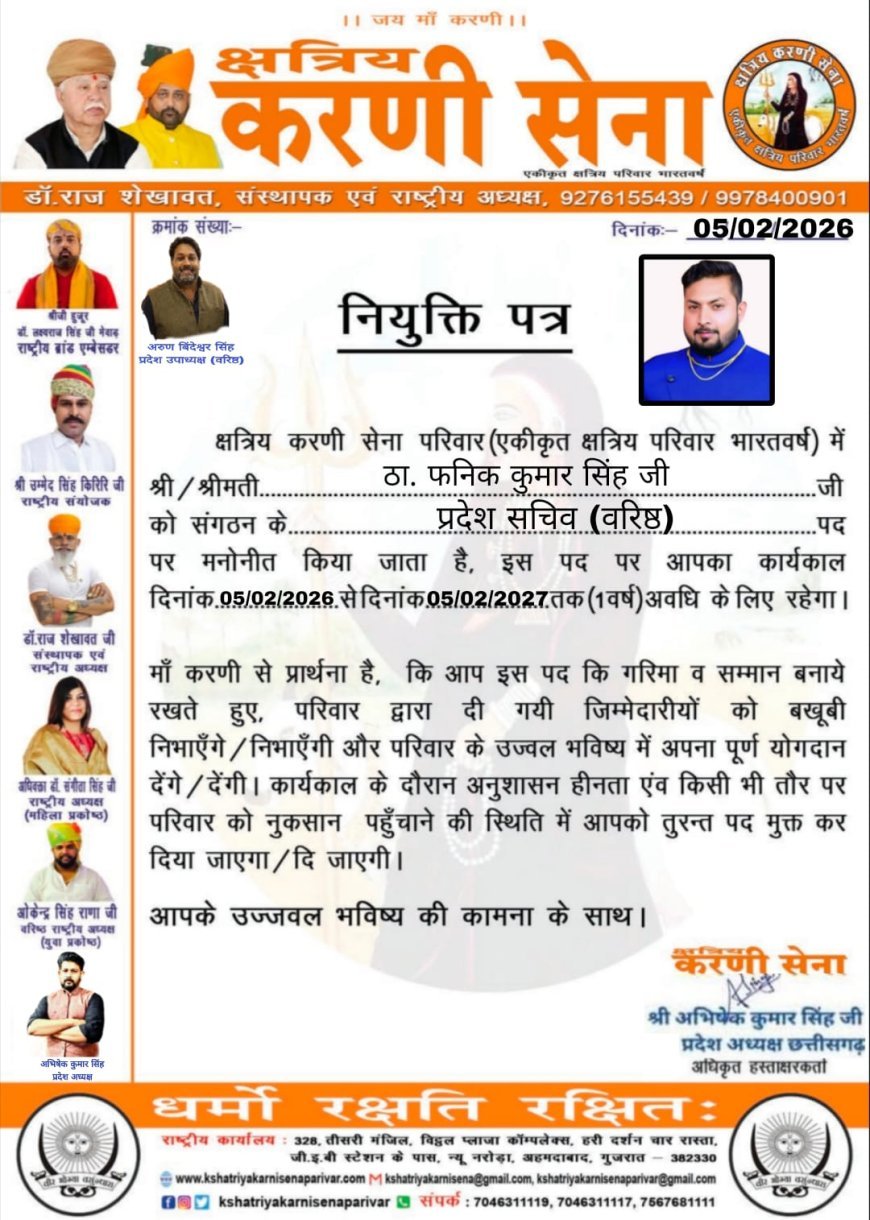 क्षत्रिय करणी सेना द्वारा संगठन के विस्तार और मजबूती के उद्देश्य से यह कदम उठाया गया है। फनिक सिंह की छवि एक प्रखर और मिलनसार युवा नेता के रूप में रही है। उनकी इस नियुक्ति से न केवल संगठन को मजबूती मिलेगी, बल्कि समाज के युवाओं को भी एक नई दिशा मिलने की उम्मीद जताई जा रही है।