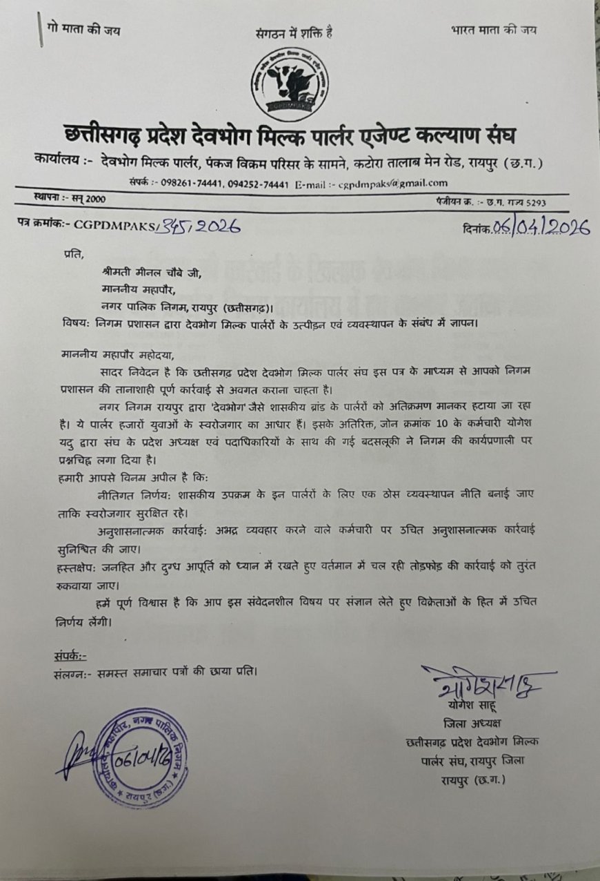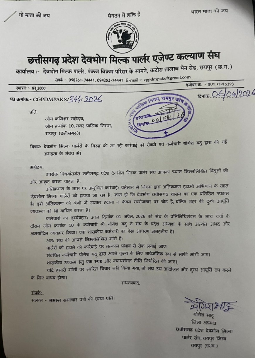 रायपुर में देवभोग मिल्क पार्लरों पर नगर निगम की कार्रवाई को लेकर संघ ने कड़ा विरोध जताया है। संघ ने कार्रवाई रोकने और संबंधित कर्मचारी पर अनुशासनात्मक कार्रवाई की मांग करते हुए आंदोलन की चेतावनी दी है।