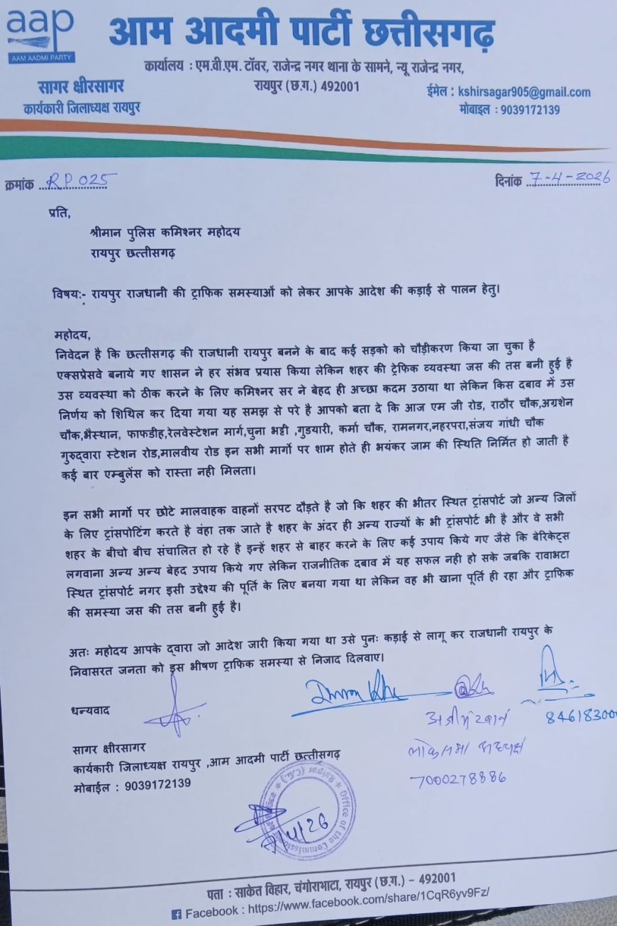 आम आदमी पार्टी ने स्पष्ट किया है कि यदि समय रहते ठोस कदम नहीं उठाए गए, तो यह समस्या और गंभीर रूप ले सकती है। शहर के सुचारू यातायात और नागरिकों की सुरक्षा को ध्यान में रखते हुए प्रशासन को जल्द प्रभावी कार्रवाई करनी चाहिए, ताकि रायपुरवासियों को जाम की समस्या से राहत मिल सके।