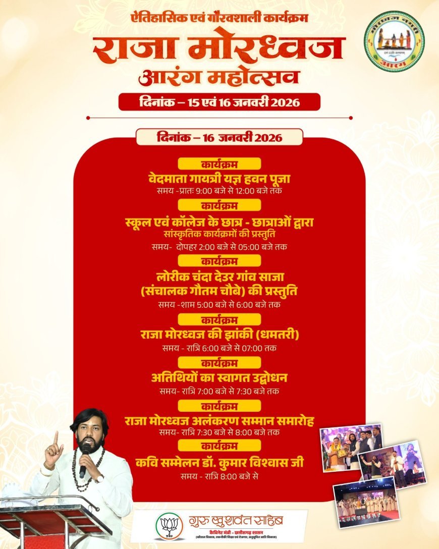 UNITED NEWS OF ASIA. अमृतेश्वर सिंह, आरंग/रायपुर। छत्तीसगढ़ की सांस्कृतिक चेतना, त्याग और धर्म की अमर परंपरा को पुनर्जीवित करता राजा मोरध्वज आरंग महोत्सव आज 15 जनवरी से आरंग की ऐतिहासिक भूमि पर भव्य रूप से प्रारंभ हो गया है। दो दिवसीय इस आयोजन ने आरंग को प्रदेश के सांस्कृतिक मानचित्र पर एक नई पहचान दिला दी है। इस महोत्सव को ऐतिहासिक स्वरूप देने का श्रेय क्षेत्रीय विधायक एवं कैबिनेट मंत्री गुरु खुशवंत साहेब को जाता है, जिनके नेतृत्व और दूरदृष्टि ने इसे सांस्कृतिक पुनर्जागरण का प्रतीक बना दिया है।