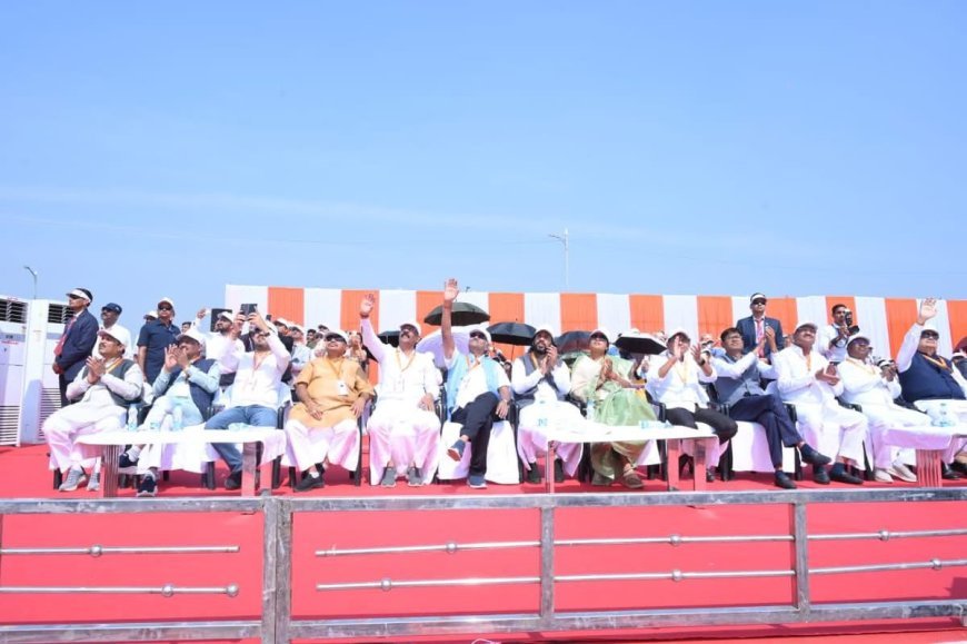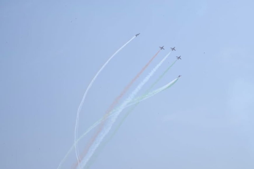 एयर शो के दौरान सूर्यकिरण टीम के नौ हॉक मार्क-123 फाइटर विमानों ने हृदय, डायमंड, कॉम्बैट, और लूप जैसे कई रोमांचक फॉर्मेशन बनाकर दर्शकों को मंत्रमुग्ध कर दिया। जब विमानों ने आसमान में तिरंगे की आकृति बनाई, पूरा परिसर “भारत माता की जय” और “जय जोहार” के नारों से गूंज उठा।