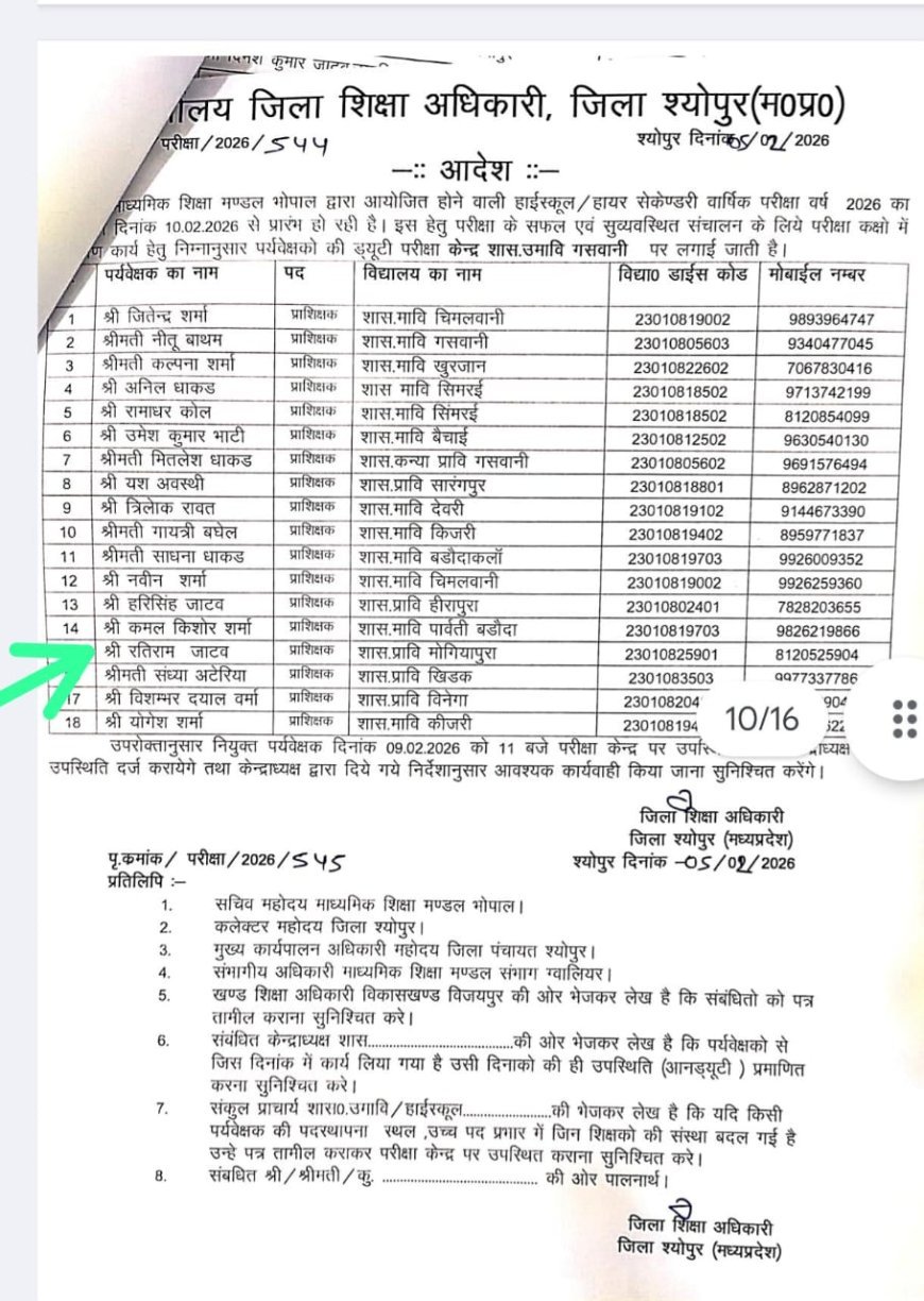 UNITED NEWS OF ASIA. नितेश उपाध्याय, श्योपुर/विजयपुर। मध्यप्रदेश के श्योपुर जिले के विजयपुर से शिक्षा विभाग की कार्यप्रणाली को लेकर गंभीर सवाल खड़े करने वाला मामला सामने आया है। यहां शिक्षा विभाग द्वारा 31 जनवरी को सेवानिवृत्त हो चुके शिक्षक रतिराम जाटव को 10वीं और 12वीं बोर्ड परीक्षाओं की ड्यूटी सौंप दी गई।
