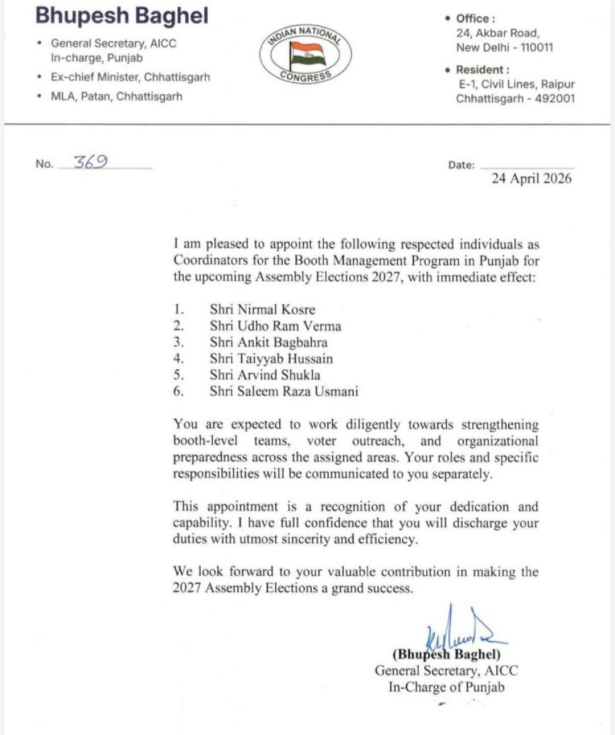 पंजाब विधानसभा चुनाव 2027 की तैयारियों के बीच सलीम रजा उस्मानी को बूथ मैनेजमेंट प्रोग्राम का कोऑर्डिनेटर नियुक्त किया गया है। दंतेवाड़ा के बचेली क्षेत्र से जुड़े उस्मानी की नियुक्ति पर स्थानीय स्तर पर खुशी का माहौल है।