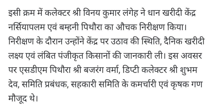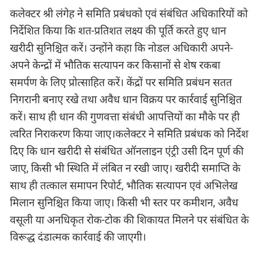 इस गंभीर समस्या को लेकर किसानों ने शासन एवं जिला प्रशासन से मांग की है कि धान खरीदी की अंतिम तिथि में वृद्धि की जाए तथा प्रति किसान खरीदी लिमिट को बढ़ाया जाए, ताकि सभी पात्र किसान अपनी पूरी उपज समर्थन मूल्य पर बेच सकें। किसानों का कहना है कि यदि समय रहते समाधान नहीं किया गया, तो उन्हें मजबूरी में धान औने-पौने दामों पर बेचने के लिए विवश होना पड़ेगा।